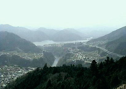 西尾根の肩より相模川川と甲州街道.右脇は子孫ノ頭の裾を回り込む中央高速道.相模ダムの左脇が嵐山405.9m. ダム上流は向かいが篠原川の入江に聳える高倉山と金剛山. . |