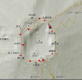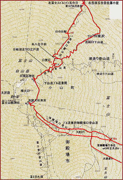 | 昼食 風を避け岩陰で昼食を摂るのも大変だった。ラーメンを作る。 コンロの火は点けても点けても消え.ザックで壁を作り漸く暖かみを摂ることができた。 燃え上がる炎と暖かいスープ 寒さに振えている子供達も食べるにつれ.落ち付き食欲は増している。 荒れる大砂走 強風で砂粒が飛んでくる。スコリアと呼ばれる細かい火山灰の粒子が数mも堆積する場所。 頭を上げると待っていたとばかり襲ってくる。頬を打ち.体にパチパチと音を立てながら当たった。 頭は上げられず風に背を向け息つくも.目は開けられなかった。 半目で瞑るよう足だけが急斜面の砂地を進んで行く。ガスも湧きだした。 その中.子供達は喚起を上げ転がるよう落ちて行く。 足を止めるには転ぶしかない。転びに転び走りに走る。 転んで起き上がる時の痛さ。それは転んだ痛さではなく,烈風が待ちに待ち.狙うよう襲う痛さ。 砂のような礫石の粒子が塊りをなし体に襲う。体に当たり.バリバリとけたたましい音を立てている。 私も砂の痛さを痛感させられた。逃げる場所がない。地面に這い見詰め下るのみ。 大石茶屋 下の茶屋で前回同様.洗面器を並べ.順番に洗顔する。 洗面器には今回も1/3程の水が入っている。年の順で洗うが最後の俊雄はぶつぶつ言っている。 最初の洗面器で砂を落し.2つ目の洗面器で洗う。そして洗面器を移動する毎に顔は綺麗になってゆく。 怒る俊雄も洗い終わると.すっきりした顔になっていた。 御殿場.ニンジン湯 下山の行程が決まっているよに御殿場に下り.銭湯「ニンジン湯」に浸かる。 今年も3時を待って.1番で湯舟に飛び込んだ。 今回は前回のこともあり.土間で綺麗に足の砂を落とした積もりだが.やはりかなり残されていた。 何も云わぬ女将に申し訳ないが快く浸かることができた。大きな湯殿の湯が溢れだす。 今回は他にも客がいる。石鹸を頭に付けるのを見て.シャンプーを差し出してくれた。 3時半.早めの小田急御殿場駅発のロマンスカーに変更し.運転席前.一列目の席を取ることができた。 何時ものことだが子供の活力は素晴らしい。環境が変われば車内を走り回る底知れぬ力を持っている。 新宿.RHC同期会 新宿で子供と別れる。真佐子に新宿から帰れられるかと問うと当たり前と頷く。 本当は自分達で俊雄を連れて行きたかったと。頼もしく頷く弟達.でもお父さんが居て良かったと。 末っ子.俊雄はここでも不安げに見詰めていが。 子供達と新宿駅で別れ同期会に参加。和田の段取りで大川.田沼も集まった。 山帰りで嫌われたものの風呂に入り着替えをしてきた。仲間は皆.直ぐ理解してくれているのだが。 一席設けてくれた店は高そうな焼肉で美味かった。予算は和田に任している。後もあると? 誰が見ても山仕度.東京の真中の新宿のクラブにザックを持ち込んだ。良い顔するはずがないが仲間もホステスも良かった。 会社帰りで全員が背広を着ている。その中.私1人だけが山仕度.服装は無難にしているが. ただ登山靴とザックは変えようもなかった。 嫌な顔せず隣に座る若い女の子.彼の叔父が経営する店にフルコースで頼み込んだらしい。 山も友も素晴らしい。楽しい一時を過ごす。 富士山駅伝 翌6日.富士登山駅伝は荒天で五合五尺で折り返しと急きょ変更した。 テレビ中継を見て喜ぶ子供達がいる。自分の足で歩いて来た下山ルートが今テレビの大画面に映り出されている。 その中.司会の声も大きいが走り転ぶ走者がいた。そこは大砂走.昨日.子供達が走った場所だった。 子供が頑張れと応援する声が部屋中に伝わり.妻には昨日の行動を忠実に.体を冥一杯使い状況を伝えている。 私は2日酔い。更に子供の歓喜に酔い.飽きることなく理屈を付けては再びビールを呑む。 富士山東面地形図