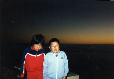 小屋前の夜明け.真佐子.博史 一点の光が夜明けを迎える ご来光を浴びる。隆史は最後まで小屋の窓に居座り覗いている。 真っ暗闇の下界は雲海の下に東窓 震える冷え込む中.目を覚ます。夜明けが望める寝床を陣取ったので.子供達は日が出るまで寝具に包まれ窓から覗いていた。 そして真佐子.博史は外にでて足元に雲海を望み.ご来光を仰ぐ。隆史は窓際にひがみ付き覗いていた。 8月17日.快晴 日の出館―富士山頂―大砂走―新2合目.富士急バス=小田急御殿場.ロマンスカー=jr新宿=三筋 明け方 夜明けの闇は一点のきらめきが赤味をおび.霞を帯びた境からは朝陽が子供たちの頬を照らしだしていた。 闇の薄暗い顔に白味を帯びた途端に淡いピンクに染まり.子供たちだけでなく山全体をも赤らめた。 そして足元の闇深い谷は次第に白みだし.白さが増すと共に私達の足元は一面の雲海が広がりだした。 子供達の暗がりからの頬もピンクに染め.更に赤味を増してきた。 もう眼下の雲海は白き輝きに満ち.泡盛る雲上を海原の如く明るく現し始めていた。 朝食,山小屋風景朝食 食事を済まし富士の頂を目指す。 殆どの登山者が宿の朝食を摂る中.我が家族の善にはコンロで温かいおでんを煮込み.ハムを炒め.生卵にご飯を乗せている。 又子供のザックからは好きなものを取り出し3品.4品と増して行く。 水も十分持ってきた。十分な睡眠と食欲がこの先を左右する。皆欲く食べた。 晴れ渡った雲海上 |