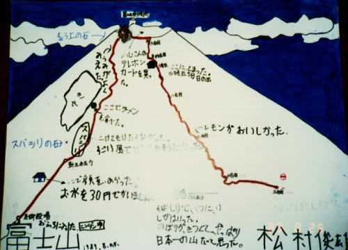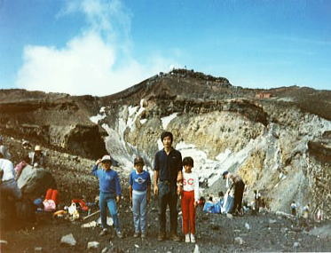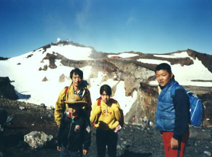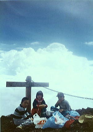 | 夏富士V.平成元年(1989年)08月04〜05日.俊雄を連れ m私.真佐子14歳.隆史.博史13歳.俊雄9歳 末っ子を富士山の頂に立たせようと親子4人の富士山々行 スバル5合目―8合目「白雲荘」2714m泊―富士山―大砂走―御殿場新2合目・・ニンジン湯とロマンスカー運転席前. 8月04日. 竹町6:30=新宿.富士急行バス7:45=10:07スバル新5合目:30一6合目11:10一12:18.7合目:33一15:10本8合目.「白雲荘」h.消燈17:30. 台風接近.台風の間を抜っての登山 竹町.自宅前で 爽やかな末っ子の顔富士山へ 食糧は子供の好むものを一品ずつ選ばせ.行動に合わせ組み立てる。 私の嗜好は相変わらず朝の生卵と酒。 飲水は空の時を考え1.8リッター酒パックに水を入れ.水筒とし各人に持たさせた。 それ故.炊事にも十分余裕ができている。 後ははしゃぎ回る末っ子の俊雄を皆で監視することにある。 姉弟三人で末っ子を登頂させる予定だったが又もや私も行く嵌めになっていた。 これは妻からの要望ではない。子供からの希望になる。 出発前のスバル新五合目白雲荘 前回より宿を頂近くに求めたのが失敗だった。日没と共に混み始め団体も入り.寝床は鮨詰め状態に。 久し振りにテントで寝たような混乱と夜中の騒々しい小屋は富士山特有の山小屋風景のようだ。 山小屋で頭.足を交互にして寝かされるとは考えてもいなかった。 |
