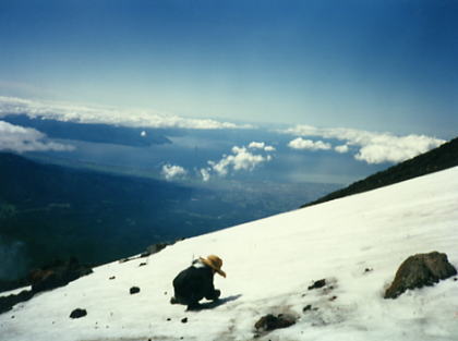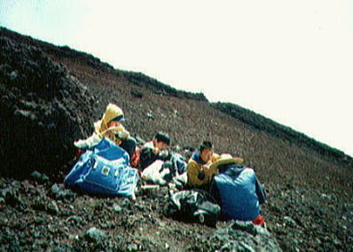 | 下山 山頂.御殿場口. 驚くことに郵便職員が富士の頂で記念切手を販売していた。商売熱心に頭が下がる。 俊雄には富士の絵が描かれたテレホンカードを選び与えている。 風の強い中.頭上は明日催される富士山駅伝に備えてか? 自衛隊ヘリの騒音がけたたましい。 御殿場口に下る随所で自衛隊員が配置に付き.その準備に忙しく群がっていた。 烈風 下るにつれ風は強まり.残雪の大きさに俊雄は目を丸く見張っている。 休むとトコトコ残雪に向かい歩きだし,好奇心旺盛だが見守っていないと何処へ行くのか分からない。 飛ばされてはと慌てて近寄るが小さな手.いっぱいに雪氷を握っていた。 雲が上昇.荒れ始める8合目.横殴りの列風が体を襲う.体温を奪い涙がでてきた。 頬はこう張り.ちり紙が真横を走っ行く。雨雫も横へ飛びだした。ふら付く俊雄のベルトを掴み掴み下る。 御殿場口七合半.風を避けラーメンを作る |