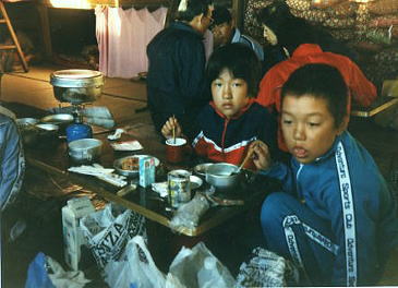 | 弟.2人が交互にバテだすが最後の鳥居が見えてきた。 傾斜が落ち.その先に頂がある。 最後の最後に走り出す弟達.子供のエネルギーは不思議なほど凄い。 何時も感心するが子供の体の何処かに.秘める力を常に蓄えているようだ。 富士山頂 山頂の火口壁を背に 食欲旺盛な子供達富士山頂 向い風を受けると頂にでた。 半地下の大きな山小屋が軒を連ね.店先にはお土産が綺麗に列べられている。 そこを過ぎると火口壁を覗き込み山頂の全体像が望まれた。火口から這い上がる風が冷たく心地よい。 風を避け軽食を摂る。ザックからは魔法の如く食糧が出てきた。 頂まで来たことで自分で背負って来た食べ物を子供達は自慢げに取り出した。 自分が担ぎ上げた好きな食物を食べてよいと私にも勧めてくれている。 「ありがとう!」と真佐子から受け取ると今度は隆史.博史からお勧めの誘いが掛かる。 子供達には個人装備以外.間食と各々水を持たしている。それ以外に私は酒紙パック1.8リッターを持参した。 頂から御殿場へ大砂走 まだ時間が早いので須走りの下りを変更し.御殿場への大砂走を下ることにした。 妻がこの頃よく話す大感激した大砂走を。 私にとっても大砂走は初めてでだった。 雪富士は4.5回通ったと思うが.無雪期初めての富士.登るとは思っていなかった。 最後に入山したのは1974年04月.同期鈴木と遊びに来て.86年には家族でハレー彗星を探索しに雪富士に訪れている。 凄い星群で子供が雪の中.震えながら天を仰いでいた。子供たちも覚えていた。 明け方の愛犬サムの喜びよう。快晴の蒼空と雪積もる大地を子供達とはしゃぎ回っていた。 大砂走.足が痛い痛いと言いながら子供達はわざと転ぶよう走る。走る勢いは止めることが出来ず.落ちるよう走る。 停まる時は何時も転び回る。いかに砂埃になろうと関係なく奇声を上げ落ちて行く。 広大に続く砂走りの裾野は延々と続いていた。 茶屋 下りの「大石茶屋」2合目で洗面を求めた。一杯50円の洗面器に1/3ほど水が入っている。 洗面器4つを並べ右端より順番に顔を洗った。 初めの洗面器は直ぐ砂まみれになる。濁る洗面器に次の者は嫌がるが仕方がない。 1つの洗面器では砂の汚れは落ちないほど砂まみれになっていた。嫌がるのを強引に従わせた。 順次4つの洗面器に顔を浸けた。結果を見て直ぐ理解出来たようだ。 皆.スッキリした顔だちになっていた。気も心も晴れ晴れしている。 顔を洗った茶屋で時計を忘れ.ロスすること30分 その間にバスは出てしまていた。御殿場新2合目(現在の5合目)で1時間.待っ嵌めになる。 |