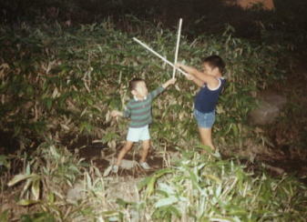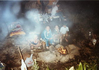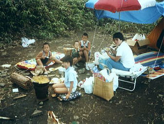 冬用天幕を持参.パラソルがよい残念だが塩山から塩平まで林道を入りるも.現場に入りゲートは通行止め。仕方がなく引き返す。 もう梅雨期から大分経つが改修は進んでいなかった。まだパサコンもない時代で現地に行くまで分からなかった。 塩山へ往路を下りながら考える。このまま帰宅する訳にもいかず。 中央高速道に入ればもう霧ヶ峰も近い。更に先信州へ足を伸ばすことにした。20年振り再び霧ヶ峰に出向く。 諏訪のスーパーで豆腐等を買い出し,初めて家族でのテント生活を楽しむ。 互い協力し合い飯盒で飯を炊き,シュラフに寝る。先週.新しくシュラフ3具を買い込んでいる。私だけシュラフカバーのみとなるが。 県営キャンプ場は広く.隣りのテントも樹林に遮られ.互いに覗めぬ良さがあった。 何時も何かを食べてる8月12日快晴 車山をリフト@70で登る。初めてのリフトに子供は興味しんしん。 真佐子ははしゃぎ.隆史はじっと堪えるようポールを握っている。博史は「怖い!」と叫ぶ。 草原の丘に蒼空が広がり.グライダーがその天空を飛行し続けていた。 心が洗われる風景だ。もう子供達も恐怖心より憧れに惹かれ.ジッと見詰めていた。 焚火は一日中.消えることがなかった。薪は幾らでも拾える。 懐かしいチャンバラ 6人冬天.内幕を外し8人用に帰り.諏訪で国道沿いの回転食堂に寄っている。 鳥の唐揚げが出れば寿司もあり.仕舞いにはケーキにアイスが廻っていた。 羽毛シュラフ1.夏用シュラフ2.羽毛テントシューズ1を購入。以後,私はシュラフカーバー(ナイロン1枚のペラペラに袋)を使用 キャラバン登山靴は真佐子.隆史.博史のを購入(池袋石井スポーツ) |