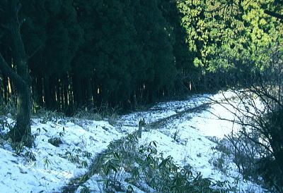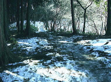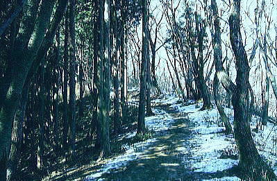 根を上げ始めていた足。1時間ちょっとで更に熊倉山を越えれば浅間峠にでられた。 高尾から綴られた「関東ふれあいの道」.尾根径のコースは浅間峠で右に折れ北側へ下っている。 日原峠まで行かなくとも.ここから南側の鶴川へ降りられる。ただ眺望はこれからも得られず。 下山 三国山から佐野川峠へと南尾根を下ると甘草水分岐(かんぞうすい)に着く。この辺は桜の木が多く.花見に多くの人が訪れるという。 甘草水は日本武噂が岩を鉾で打ったところに水が湧いたという伝説が残されていた。水場は左へ数分の所にあるが枯れている。 佐野川峠の手前で谷間に下れる分岐にでる。直進すると下岩方面へ。尾根と分かれ右の上岩へ.黒田川へ回り込む滑り易い. 雪斑なトレースを下ることにした。谷間に入ると源流は雪白き雪原に覆われた。西側の谷に入り.春雪の踏み跡から雪凍るトレースへ。 途中で雪面が切れた水場でラッパ飲みをしている。帽子とメガネに雪粒が当り.外して呑んでいる。 這うような姿勢で飲んだ沢水は雪面を割り岩盤にチョロチョロ流れていた。テルモスやお茶と違い.雪塊りの割れ目からの冷水は喉を潤す旨い水だった。 奥の院との分岐.軍刀利神(ぐんだり)元社へ続く男坂(表参道)は積雪に埋まり雪原化され分からなかった。 約300mの古い石段が残っているらしい。ここを左に折れるとトレースされた雪面を綴り軍刀利神社奥の院に下る。 トレースを外すと膝まで潜り.以外に深い春雪に埋もれていた。又日陰の谷間を覆う雪表は以外と木屑類などの飛び散りもなく. 雪白く綺麗な新雪の形で残されていた。ただ下腿まで潜るトレースは続いている。 軍刃利神社奥の院と大カツラ小さなの社には大ツガが御神木として聳え.参道は又登山口も兼ねていた。その下に幅広い舗装された林道が綴られ横切っている。 半ば凍った残り雪を絡めるようズリ滑り小走りで下っている。幾つもの鳥居を潜り.黒田川左岸の軍刃利神社の参道にでた。 そして左肩に軍刀利神社の社務所を臨むようなると井戸の集落も近かった。 軍刃利神社は1049年(永承3年)の創立され.当初は三国山の山頂にあった。 武州檜原郷.相州佐野川郷.桐原郷の総鎮守と称されたが野火に遭い.延徳年間に現在の場所に遷座されている。 熊倉山南東尾根の取付きはバス停井戸方面から見ると軍刃利神社の大きな鳥居の手前を左に折れ.長泉寺の本堂裏からになる。 熊倉山は笹尾根にでてから縦走路を右へ折れた所にあり.更に越えた所に軍刃利神社にでて.更に三国山にでる。 下って来た参道口に建つ軍刃利神社の青銅製鳥居.15:53井戸.新屋の集落 最奥の集落のその奥に厳かな軍刃利神社があり.本殿,奥社.元社と参道が続き.幾つもの鳥居を構え.その簡易舗装道を下りてきた。 集落口には青銅の大鳥居が構えていた。その左脚には天然記念物の「サイカイの木」.雄木18m.幹4.12mが植裁されていると後で知る。 立派な道路と豊かさを示す家屋が新屋の集落を埋め.バス停まで立派な家並が続いていた。 バス停「井戸」では浅間峠を越えてきた3人の女性軍に迎えられた。 そう云えば生籐山で擦れ違ったハイカーも単独行の女性2人だけだった。中年女性は何処でも強い。 明治の森.高尾から城山へ。そして奥相模の山稜を最後まで詰め三国山から笹尾根を下る。井戸からjr上野原駅への路線バスを利用し 相模の境を越え.境川を南下して山とも別れた。次回は多摩三頭山からの笹尾根上半が残されている。 新屋地区より熊倉山南西尾根と井戸の里 黒田川下流流域の集落.15:57尾根左端にある長泉寺裏から笹尾根を横切りトヤド浅間へ.2011.02 熊倉山南西尾根の上部 井戸バス停まで離れて黒田川上流を振り返る.16:20580m圏.758m点.910m圏. 黒田川の右岸沿いに並行する熊倉山南東尾根(省武連指尾根)の末端の途切れる境がレイク相模CC。棡原藤野線から黒田・上野原棡原線にでて. 栗坂峠からの小伏の道と合わさり.聖武連山の麓から鶴川の左岸沿いの上野原丹波山線を綴ると新田にでる。 このアプローチは大分先になるが25年4月に熊倉林道の陸軍滝から訪れている。又23年3月には栗坂峠越をして新田にでていた。 16:00井戸bs:38.富士急行山梨バス¥410=17:00jr上野原¥1.110. :09=17:32高尾.中央特快:35=18:17神田. jr上野原駅 上野原駅は1つの島形ホーム。切符売り場と売店はホームを挟んだ中央の構内にある。当然上りホームと下りホームは1つのホームだが別々の改札口から 出入りでき.初めて利用する私にとって駅に不思議な感覚を覚えている。同ホームの両脇は結ばれていた。 jr藤野駅 柔らかい夕陽を車内にいっぱい受け.列車が藤野のホームに入線する。卒業式か? 花束を持った女高生がゾロゾロ車内に入ってきた。 「キャ-キャ-!}と黄色い声は賑やかだ。発車時間が過ぎるもゾロゾロ集まる女学生。扉が閉まるのを抑える子.叫ぶ子。 次から次,仲間達が駆け込み.一度扉は閉まるも車掌は再び扉を開けた。それを目指し.又駆け込む女学生達。 車内は急に騒々しさを増し.漸くして扉は閉ざされた。