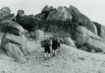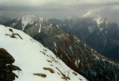 | 早川小屋 半ば残雪に埋もれた小屋に入り込むと.小屋は外見に似合わず大きく細長かった。 土間が中央を通し.それを挟むよう一段高い床があり.ゴザが適当に敷かれている。 そして向かい側にも入口がある。20人程入れる小屋だが詰めれば40人も収容できよう。 外側に押し開け式の窓がある。棒切れを探してきて押し開けると目の前に北岳が飛び込んできた。 昨日の峠以来.眺望のポイントは.やはり西側の眩いばかりの北岳の.白嶺に限られた。 今も又.小太郎尾根と吊尾根に挟まれた大樺沢の雪渓を真正面に望む。 雪壁を構えた頂は孤峰を誇り.一段と高く聳えていた。 西陽 斜陽した西陽が窓を透して小屋に差し込むと.小屋の中は急に明るくなる。今日.初めての焼けた陽差しが部屋一杯に広がった。 東側の窓は.まだ全部分が雪に埋もれていた。ほんの一時の陽差しが部屋を明らめている。 コンロを囲んでいた僕等はローソクの火を消した。陽は一段と小屋内全体を明らめる。 窓際には靴下.スパッツ等の干し物が気休めに干されている。最後の陽はそこをも照らしだしていた。 その下には登山靴も板壁に支えられるよう並び干してある。 ヨーロッパ風のカラフルな山小屋ではなく.石造りのがっしリした造りでもない。 素朴な木造りの重々しい早川小屋. 一見今にもきしみ倒れそうだが確りした木造の骨組みがある。 それは古来から建てられた日本独特の山小屋のような簡素さだった。 残雪に半ば埋もれたこの小屋に安住を求め.一層惹かれたのは疑いもない。 窓から差し込む夕日を浴びながら炊事に精をだす。 帳が落ち代わってローソクの灯が活躍した。これからラジを囲む楽しい夕べが待っている。 早川尾根小屋―甲斐駒ヶ岳―七丈小屋 甲斐駒ヶ岳より鳳凰山と遠く富嶽5月07日.曇後雪みぞれ 早川尾根小屋c2. 5:55一7:43アサヨ峰8:00一9:37仙水峠一12:45摩利支天:55一13:41駒ヶ岳14:00 一15:45七丈小屋hc3 早川尾根ノ頭 疎らになり始めた黒木の緩やかな起伏. 早朝の硬雪に踏み込むと直ぐ早川尾根ノ頭にでる。 この辺は岳樺も目立ち.面白いほど立木の幹を曲げ極端な姿を現わしている。 ミヨシから早川ノ頭間は早川尾根で最も積雪が多い所。 朝から照り付ける陽差しに暖められ.ザラメ状の雪がよく足を潜らせる。 潜り込まぬよう一定の歩調で歩むも.もう限界だ。雪表の堅い雪を割って膝まで潜り込む。 チキショウと踏ん張って足を抜こうとすれば.もう一方の足も.その二の舞になった。 アサヨ峰 大きな岩の積み重ねのアサヨ峰は360度の展望が開け.甲斐駒ヶ岳の荒々しい非情なまでの霊峰が望まれた。 眺望を楽しみながらホッカレモンのチューブを吸う。割れた唇にしみヒリヒリするも美味かった。 頭上を仰ぐと何時のまにか雲堤が一面流れ込み陽を隠している。そして風が出てきたようだ。 少し肌寒く崩れ気味の天気になる。 這松混じりの岩稜を飛ぶよう降りる。 調子に乗ってボンボン降りるので.いざ停まるとなると大変だ。数m先まで惰性が走る。 この登りは大変だろうと思う内.再び積雪に被われた樹林帯を抜け.小平地にでる。 仙水峠 大きなケルンが立ち.目の前に屏風を連ねた摩利支天の巨壁が伺える。 そして谷間へ深く切れ落ち.大武川へ垂直に落ち込んでいた。 この異様な眺めとは対照的に仙水峠は小陣まりした峠だった。 小さな小さな峠が僕を楽します。縦走路に似つかわしい憩いの場.誰もが留まることを強いる峠にでる。 明るい峠だった・・ 南アルプス北部概念地形図T |