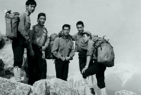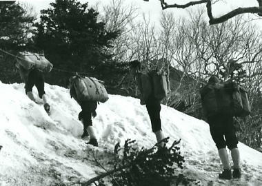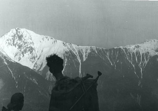 | 鳳凰三山.甲斐駒ケ岳への径 s41年(1966年)05月04〜08日. L西村博臣.sL滝島静昭(3).m和田一男,三浦俊彦.松村進(2) 夜叉神峠―鳳凰三山早川尾根―甲斐駒ヶ岳黒戸尾根―白須 5月04日.新宿= 5日.甲府=夜叉神荘一南御室小屋hc1 6日.c1一早川尾根小屋hc2 7日.c2一駒ヶ岳黒戸尾根.七丈小屋hc3 8日.c3一白須=韮崎=新宿 早朝の甲府駅を発ったバスは満員の登山客を乗せ.御勅使川に沿って山の懐に入って行く。 車窓には白峰の山並みが広がり.うとうとする瞼に今だ真白き雪帽子を乗せたこれから望む山々が望まれた。 夜又神峠の車窓から5月04日晴.新宿23:45= 5日晴.3:25甲府4:20.山梨交通¥230.=5:35夜叉神荘一6:32峠一11:50南御室小屋hc1. 鳳凰,南御室への径 夜又神峠の登り早川尾根の径 夜又神峠から確り踏み固められた赤土の大崖頭山を巻くよう登って行くと.賑やかだった夜叉神峠の装いを遮るよう静か山波に変っている。 そして漸く山に入ると云う実感が湧きだした。この森の先に今日の泊場.南御室が在り.明日は早川尾根に乗る。 大部分が樹林に被われ.吹き溜る残雪が多い。 岩稜と樹林とを旨くミックスさせた鳳凰連山では他人に拘束さられぬ自分達だけの山を味わうことができそうだ。 峠から離れると疎らになった登山者.すれ違う人もいず。 知らずして黒木の樹林に入る。昼間なのに光を閉ざす薄っ暗い森に残雪が被い.次第に積雪は増しだした。 残雪を踏みしめ.薄暗い樹林帯を縫い歩くのは実に楽しい。5月の雪山に心は踊り続けている。 雪と戯れ.腐り切った残雪を踏むと4寸程潜る。 交互に足を出す雪の感触が楽しく.枯木に腰を下ろす休む1本にも.気ははしゃいでいだ。 少しガスが切れた所で秀麗たる冨士が遠望されたが.ここ私の脇からは目の前に日本第2峰の北岳がデンと構えている。 南御室までは苺平付近が一番残雪が多かった。まだ春山の姿を見せ付けていた。 穏やかな南御室の鞍部.樹林を切って小平地が築かれ.そこだけ裸土が現れている。 そして所々雪融け水が溜まっていた。 南御室小屋―鳳凰三山―早川尾根小屋 ![]() |