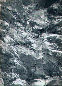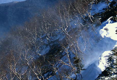 | 黄蓮谷のツメで滑落 氷化しだした雪面はしばし滑りそうになる。 僕はアイゼンを付けるべきと言おうか.言わない内.アーと言う間に転び滑り落ちる。 ここは黒戸尾根のツメ. トラバース気味の斜面だった。 反射的に体を回転させピックを刺す。氷り始めた堅雪に浅く刺されたピッケルは一瞬停まるも.停まらずにいた。 停まるか停まらぬ間ぎはの勢いでズリ落ちた。 2度目の打ち直しに再び滑りだした。勢いは停まることを躊躇っている。そして3度目の振りで停めることができた。 ほっとするも支えはピッケルのピックのみ.氷と砂礫に乗った不安定な足元は日が翳り.一瞬にして氷りだしていた。 堅雪に足場が切れない。靴先を雪面に叩くが堅い反応だけが返ってくる。 体はピックに支えられた間々である。足は浮き.雪塵が氷化した雪壁を越え黄連谷に落ちる。 孤独焦 やだと思っても足場を作る以外ない。空身なら兎も角キスリングを背負っている。 幾度も雪面を叩き.焦りが支配し始めた頃.どうにか身を起こすことができた。 壁.大地と胸との間に空間が幾らかでき.視野が少し広がった。 数分で氷化した斜面. 恐怖心が走るも.まだ上まで戻れそうもない。息を整えるが気は焦っている。 動くこともできず如何にかせねばと。アイゼンの先にツァケがあればと思うも.靴先の硬い反応だけが返っていた。 諦めか.如何でもなれと考えがフト浮んだ。腕力が抜けだしバテてきた。 焦る気を押さえるのみで他に考える余裕はない。ただ足元だけでなく周りを見る力は残っていた。 執念 壁の中.1m脇上に這松の割れ目を見出だした。 支えているだけで力が入いらず。ブレードで小さなバケツを作り這うよう近ずいた。 ひと振りで1cm四方程の雪片が数個.コロコロと跳ね落ちた。まだ足場が取れないでいる。 悪寒のような不気味な感情に恐怖心が走る。 靴底の一部が引っ掛けているだけの黄連谷に.雪片が蹴る都度舞って行く。 股の間から足の爪先へ.落ち深い壁が覗めむ谷。助けのザイルはない。自分を信じ騙すよう這い攀じる。 このちっぽけな這松が.これ程可愛らしく頼もしく思ったことはない。 引っぱれば抜けるような這松に足が掛かった。ピックが2cm程入り.支えに落ち付きを見い出した。 ゆっくり呼吸ができた気がする。 仲間の声は聞こえなかった。たぶん大声を上げ.励ましジッと見詰めていたことだと思う。 友の声が漸く聞こえてきた。 ザイル1本あれば如何いうこともなかった。全てが終わり足場に安心感が伴うまで.仲間の声は聞こえなかった。 丸っきり余裕もなく.1人もがいていたようである。声を出す余裕すらなかった。 烏帽子岩手前で転落したところを思うと黄蓮谷右俣.烏帽子沢の最後のツメと思われる。 この下にはルンゼ状のスラブが高差200mを持ち落ちている。 か細い草付に確保ができ.初めて「大丈夫!」と言葉を吐いた。 |