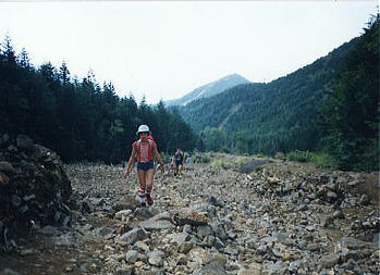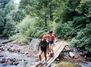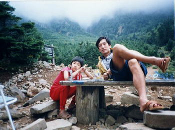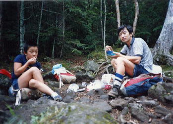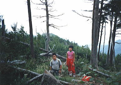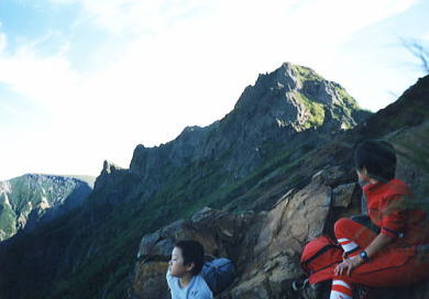 | 夏休み最後に八ヶ岳.赤岳県界尾根を横断 s61年(1986年)08月23〜24日. m私.真佐子10歳.隆史9歳 子供と再び岳へ 1週間前は子供達と共に日光イロハ坂を歩ていた。東京からの日光白根山歩き旅はひと時中断し.信州の岩稜帯.八ヶ岳へ向う。 山は7月の富士山行以来になる。宿泊山行として末っ子の俊雄はまだ幼な過ぎた。博史は同日.上野消防少年団で再び日光へ出向いている。 それ故.メンバーは私と真佐子.隆史の3人で宿は山小屋とした。 富士山と同じく食糧は豊富に揃える。山歩きにも慣れ始め.食べたい趣好品は全て持たせることにした。 以外にも子供達の菓子類は少ない。列車内のみの菓子を持ち.後は酒の摘み類に変わっている。 私が好むものを子供が選び.妻は贅沢過ぎると嘆いていた。 美濃戸口―行者小屋―赤岳県界尾根―野辺山 8月23日曇. 竹町5:58=6:39国鉄新宿:40,「あずさ51号」=9:11茅野:40=美濃戸口,農場で牛乳6:53 一12:24昼食:51一14:40行者小屋(高度2354m)h,\3300×3・・6400歩(隆史) 入山は河原から森へ入る早い朝 久し振りの夜明けの自宅.竹町から薄曇の中.子供達と元気に家をでる。笑い顔で出掛ける子供を送る末っ子.俊雄と妻。 ザックを背負う真佐子.隆史の勇ましい姿。息揚々と溢れるばかりの笑いを浮かべている。 私も背負子を背負い.仕事も忘れ清々しい思いで歩みだす。朝早い故.アスファルトに響く靴音も心地よい。 間一髪 中央快速が新宿の駅ホームに入る。 扉が開くと共に.中央本線のホームから発車のベルが鳴りだした。慌てに慌て3人が周りも気にせず走りだす。 隣りのホームには階段を一度降り返し.地下道から又登らねばならない。ベルが鳴り続けることを祈り走る。 ザックを揺らせ喘ぎホームに立つ。まだ鳴っている。一番近い扉にひがみ付き全員.乗った所で扉は閉ざされた。 運が良いのか.ため息と共にどっと汗がでた。予定より一列車.早く乗れたが心臓には悪い。席が空いていて幸いした。 |