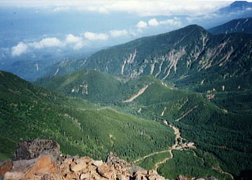 濃戸中山と峰ノ松目 頂稜に出て,昨日遡った南沢の森と山小屋 頂稜と遠く霞む富士8月24日晴後曇.霧. 起床4:30 行者小屋h6:16一8:00赤岳:50一10:56小天狗山,昼食11:58一15:00野辺山:19,臨時列車=16:00小淵沢:19,「あずさ16号」 =18: 新宿=御徒町一19:00竹町 赤岳へ 短い樹林を抜けると急登のガラ場となり.登るにつれお世話になった行者小屋が小さく見下ろされた。 足元の森に囲まれた河原に.赤い屋根の小さな小さな山小屋が望まれる。 赤岳山頂 硫黄岳と双耳の天狗岳.遠く蓼科山 権現岳と南アルプス連峰主峰赤岳 朝の柔らかい陽差しを受けた岩屑の地蔵尾根を登り.鎖を抜けると頂稜にでる。 向かいに南佐久の裾野が広大に広がり.岩稜にでて子供達を喜ばす。 目は輝き好奇と驚きの満足感に満ちている。素晴らしい眺望だ。肩ノ小屋.展望荘から一気に頂に立つ。 頂からの眺望は素晴らしかった。 北アを除き.乗鞍.御嶽.中央アルプスと山波が開かれ.南アを抜けると富士は秀麗さを誇り裾野を広げている。 北八は森の絨毯に包まれていた。 子供達はこの感動を早く母に伝えたいと赤岳頂上小屋に飛び込んだ。 電話を借り.大きな声で感情を剥き出しにし話し掛けている。 目の煌めきが何時もの異なり.短い言葉にも母にはっきり分かる歓びを伝えていた。 電話を切るも束の間.四方からガスが湧きだし視界は0になる。頂は大きな雲の中に入リ込む。 八ヶ岳横断,小海線野辺山へ 県界尾根より赤岳を望む |