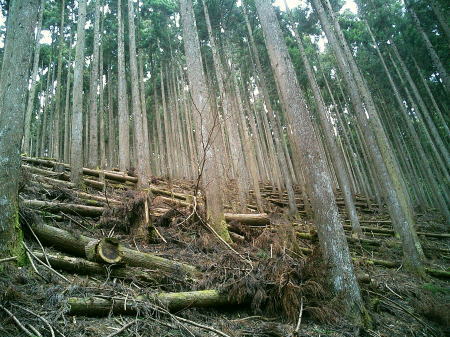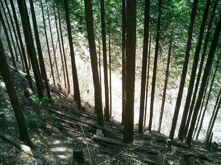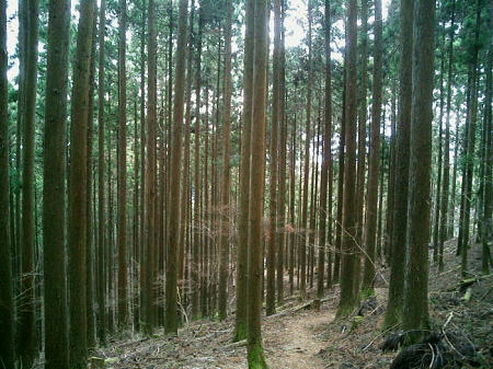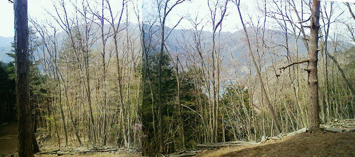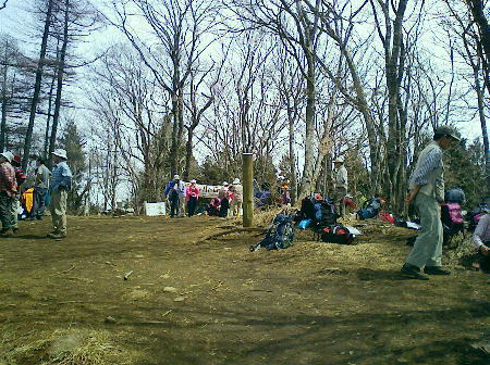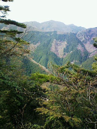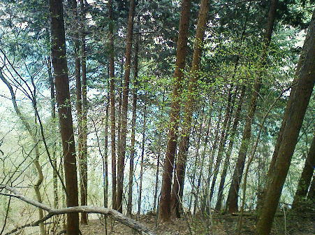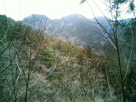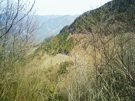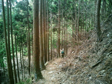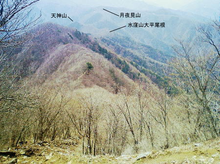 2007.04.鋸尾根から御前山―水窪山天平尾根 対岸倉戸集落から水窪山天平尾根の写真・2012.04 2010.08.九竜山.江戸小屋尾根から大岳山―日の出山北尾根 奥多摩駅前広場から九竜山,江戸小屋尾根末端からの写真・2012.01 2011.08.石尾根狩倉山山の神尾根から六ッ石山―ハンノ木尾根 2012.02.シゲクラ沢右岸尾根―湯久保尾根,尾根通 鷹ノ巣山からシゲクラ沢右岸尾根北側からの写真,・2012.04 九竜山伐採地からシゲクラ沢右岸尾根東隣りの写真・2010.08 2012.10.鴨沢から雲取山石尾根―JR奥多摩 天地山 天地山の位置は国土地理院1/5万図での表記でも複雑のようだ。古くは現在の標高1109m峰が「天地山」と表記され. 昭和47年発行の地図では981m峰に「天地山」の表記がなされていた。又ガイドブックには1047m峰の三角点の場所に「天地山」としたものがある。 実際今の現地での位置では鋸山の北の1046.7m三角点の場所に「天地山」の標識があった。 そして天地山へ向かう径は「行き止まり」の標識が立てられている。・「奥多摩.秩父」津波克明著より. その「行き止まり」先の674m峰は古い地図に天地山を経て.海沢方面への径が記載されていた。 近年地元の集落にある「東京多摩学園」により尾根からのルートが赤テープでマーキングされたと聞くも.整備はまだまだのようだ。 沢沿いは更に深く落葉がヒザ近くまで埋まり廃道化し残されている。 2009年11月海沢谷を遡った折は真新しい確りした道標は幾つもあるも先は不透明。 探勝路さえ.頂側の取り付き地点には道標がなく.枝尾根は未知のバリエイションの領域になっている。 山腹を巻くと大岳山(鍋冠山)との町界尾根にでる。 南側の赤岩沢側から常に心地よい風を受けるようなり.ここからは登計から綴られる大沢沿いの鋸林道を横断すれば大ダワは近い。 山陰に入り山腹を巻き込むと明るい陽差しを浴びたログハウス風の鋸山避難小屋が現れる。大ダワである。 この峠路は北側から赤井沢沿いから登る大入林道の終点でもあり.峠上で鋸山林道と結ばれている。 10台程の駐車場が確保され.半分程が埋まっていた。ここ峠に風はないが一汗掻いた体には心地よい。 鋸山と北側に落ちる鋸尾根 蛸口山寄りから大ダワを越えの鋸山特訓 落葉松交じりの明るい雑木林を抜けると鞘口山1142mへの登りが続き.傾斜が増すと岩混じりで山道らしくなる。 この上で以外な特訓を受けていた。千葉の高校生90名の団体が登山大会の為.鞘口山1の頂から下りてきた。 擦れ違うさま.「今日は!」と丁寧な挨拶で.私が登り擦れ違う道を上方で.待ち構えていた。それも延々と待ち構え.それにしても譲るメンバーは多く長い。 一団が抜け.間を空けると又もや一団が現れ.待ち構える姿で.「どうぞ!」の声。仕方なく頑張るが列はその都度長く繰り返されていた。 途切れのない列に休む暇なく登る私。見守られての登りで汗は滴り.腿はき付く。 漸くは通り抜けるまで休む暇もなく.見守られながらのトレーイングになる。そして今度は中年夫婦に前を薦められた。 彼女は強い。「先にどうぞ!」と言って.夫と離れ私の後にピッタリ付いてくる。追われるような登りがクロノ尾山まで続いた。 クロノ尾山少し上部で.今が盛りのカタクリの群落地を抜ける。 まだ疎らだが登山道の両脇に競い.泡紫色の長い花びらを少しひねり気味に巻き込みよう咲き誇る。 華麗ではあるが群生とは云えず.今年は例年以上に遅い花咲付きのようだった。 万葉の昔から人気の高い多年草. 今日も大勢のハイカーが鑑賞しに訪れている。 一度傾斜が落ち,再び登りだすと落葉松林が目立ちだし.最後のツメでは木道からロープの柵道になる。登ると変形十字路にでた。 南.左手の湯久保尾根と北側の「奥多摩都民の森」を結び尾根を横切る登山道を下れば栃寄へでて.この十字路を横切れば直ぐ頂に立つ。 御前山々頂 改めて驚く頂の凄いハイカーの群小広い平坦な山頂の石積の中に三等三角点標石1404.98mがある。基準点も同じ「御前山」. 御前山 多摩川沿いの栃寄から奥多摩都民の森を抜け.直接登ってきた幾つものハイカーグループで.頂は既に驚くほどのハイカーで満ち溢れていた。 まるで高尾山と変わらなかった。雑木に覆われ視界は悪い。日本勤労者山岳会のメンバーにカタクリの保護と環境保全を訴え.アンケートを頼まれる。 内容は「ゴミを捨てるか? 沢水を飲むか? カタクリの花を大切に等」とある。 ついでに小河内峠から奥多摩湖のへの下るコースを尋ねる。彼等は難路.廃道と云うのみ。下山は人多い大ブナ尾根を勧められた。 人のいない所を歩きたいと始発の列車に乗り.時間は倍取って.ここまでやって来た。藪漕ぎの覚悟もできている。 替わったチーフに所々踏み跡はあると助言を受け.ホッとして下ることにした。 季節を感じる低山の破線ルート 11:30御前山12:20一13:00小河内峠:15一北尾根一13:45奥多摩湖一14:35大河内ダム14:52. 御前山 青梅街道.湖畔の熱海付近より・・2015.10.丹波牛首の帰路左がシダクラ沢左岸尾根. 正面が御前山手前肩の惣岳山から