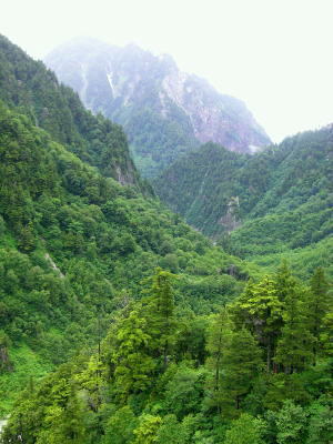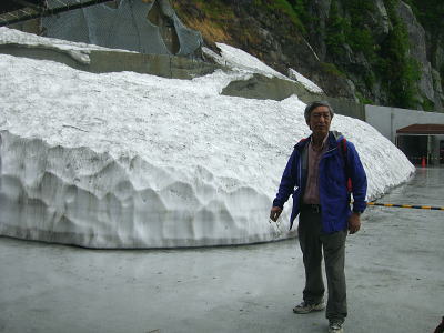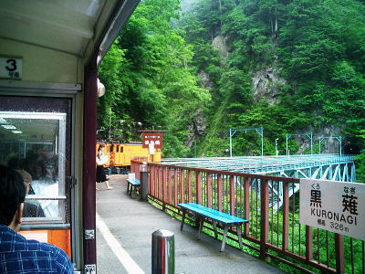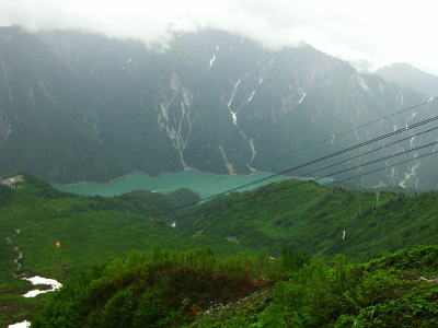 黒部第二発電所 今回の終点「鐘釣駅」・・軌道の終点は「欅平」軌道 霧雨と軌道.雨雫の黒部川を遡る。頭上はガスが舞い.広い河原は水かさを増した飛珠の流れを走らしている。 谷合いは雨雫に滴る樹葉で溢れ.両岸を覆う樹葉が青々しい。心をも清めさせる景観と澄んだ空気が心地よい。 トンネルが続き覗く峡谷と尾根。沢のツメはまだ残雪がヘバリ付いている。 小さなトロッコだが意外とレールを弾く軌道車のガタコト発する音色は煩いながら心強い。 トンネル坑内に入ると尚更響き渡り.まるでジェットコースターの如き音を耳にする。1時間程で鐘釣へ。 少し肌寒いく.昔のトロッコを想いだす。まだ関電が経営していた頃.剣岳東面の尾根と谷を登り欅平から下山した。 当日も雨が舞い.濡れた体は着替えする場所もなく寒さに耐えていた。揺れ動くトロッコでは着替えをする余裕もなく.早く宇奈月へ着けと。 カッパを着た妻がスケールの違う峡谷に喜び浸っている。トロッコはカタコト遡る。ただ鐘釣での観光用に設けられた万年雪展望台は みすぼらしい過ぎる。残雪が少なく.その上.雪上は枯葉の塵で埋め尽くされている。 ここまで入り.見なくてもよいものを見てしまった気を起こさせていた。 富山駅横「大黒や」の越中うまいもの膳白エビの掻き揚げと酢漬け.甘エビとサシ(カジキマグロ)の昆布締め.ホタルイカの魚醤油沖漬け.バイ貝と地元野菜の煮付け 7月11日濃霧. 富山7:40=立山,ケーブルカー.¥8060=美女平.高原バス=室堂.トロリーバス=雷殿.ロープウェイ=黒部平.地下ケイブルカー =黒部湖一14:06黒四ダム.トロリーバス=扇沢=豊科IC.中央道=19:00新宿 高原バス 弘法付近で立山黒部アルペンルートを横断する。相変わらず雨雲が行く先々に覆っている。乗り継ぐ事に雨雲が激しく動き.よくて霧雨が舞っている。 高原バスで一瞬の切れ目から富山平野が望まれた。町並みの先に岬と海らしかぬ海を望む。 路肩で蚤を捕る猿天狗平付近の雪層 今年は積雪25m.除雪に1億円を消費する天狗平付近から残雪が見止められだすとバスは雲の中となる。冷え込む室堂は10mも先になると妻の顔も分からなくなった。12℃. カッパ姿で湧水を汲みに。長く外に出られず.その為駅.売店は込み合っている。 ![]() 立山ロープウェイより黒部湖.対岸大スバリ沢と小スバリ沢 黒部川第四ダムサイド初めて黒四ダムに立ったのが1967年08月の夏合宿で.ダム構内に迷っている。当時は黒部川左岸沿いからダムサイドに出ていた。 ![]() 放流9t/秒