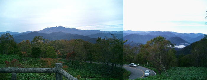 小さな二人の旅X・・小さな二人旅 2003年 2004年 2005年 2006年 2007年 2003年 2003年元旦.浅草寺 02月.チワワ 「ペコ」.飼育 11月.第三回墨田川ハゼ釣り大会 墨田川右岸テラス2004年 06月13日晴. 白山神社.紫陽花祭→ 小石川植物園(東大大学院理学系研究科附属植物園本園).徳川幕府の開設した薬草園「小石川御薬園」が起源 07月20日晴. 夜のデズニーシー 08月14日. 夜の上野動物園.日没に快走するドールの群れ.西園池之端の辺.ビヤーガーデン 10月16日厚曇. 中秋の日光周辺.日光横断と会津.赤城 宇都宮IC=日光杉並木本街道=日塩もみじライン=湯の香ライン(会津東街道)=上三衣.会津西街道=川俣温泉川治線 =奥鬼怒林道(山王林道)=戦場ヶ原.ロマンチック街道=湯ノ湖=金精峠=鎌田.沼田街道=白沢.沼田大間々線 =渡良瀬川下降=伊勢崎IC.北関東自=関越自.練馬. 距離523k. 初めは先週.連休を利用し出掛ける筈だった。 宇都宮より杉並木を抜け.会津西街道より塩原.伊南.桧枝岐へ。そして奥只見湖から守門の裾を抜け小出に出る予定でいた。 枝折峠.明神峠はまだ未舗装の国道だと聞く。 天候不順と台風22に襲われ.出発当日は暴風圏内に入り中止。一週間後.再び場所を変え出向く。 その1週間後.越後は中越地震に襲われた。 今市.日光杉並木本街道シャケの結飯 5時.家をでる。栃木で一度下りた。昔.子供と歩いた例幣寺街道を進むか迷うも再び高速の道を選ぶ。 宇都宮より一般道に下り.杉並木で朝食。三百年を越える杉の巨木林を仰ぎ結飯を食べた。 歩むとは違い.車は早かった。歩めば長い街道である。長い杉並木街道も,想い膨らみが大きいさせか? 尚更早く感じられた。 先を急ぐでもなく鬼怒川温泉を抜け.日塩もみじラインへ。 日塩もみじライン 白滝 龍王峡より塩原温泉郷を結ぶペコ 今回は愛犬.ペコを一緒に連れだしてきた。室内犬で外にはまだ数える程しか出していなチワワである。 白滝を見学。ペコはチョコチョコ歩き回り.周り全てが好奇心に満ち.見守るだけでも疲れる動きを示している。 富士見展望台より 左.男体山. 中央は大真名子連山と重なる白根山. 右が帝釈.田代山. 鶏頂山の西側の山腹を通る有料道路. イロハモミジやヤマモミジ等紅葉の名所で景観は抜群だが.まだ紅葉には早い。 連山,右谷より下り男鹿川沿いに鬼怒川へ抜け戦場ヶ原にでる。 峠 紅葉にはまだ早い。峠で見る日光.帝釈連山は大地に浮き上がるよう聳えるも.紅葉美は薄かった。 以外と遠方に望む白根山.今日の帰路はあの裏.赤城山を抜ける。 塩原での風呂を諦め.湯の香りラインへ。長い尾頭トンネルを潜れば会津の国へでる。 会津の脇 街道角.上三衣で茸満杯の味噌汁を御馳走になり.会津西街道を戻るよう回った。 そこではカジカとヤマメの燻製が路肩に並べられていた。 今.思うに購入すれば良かった。骨酒にもなり旨いかも.ただ妻は嫌がった。私を含め.林家の主人は喜んだ筈である。 会津西街道(戊辰の道) 会津西街道にでて.その間々直進すれば会津若松へ。左折すれば湯西川から五十里湖へ戻る形となる。 男鹿川を右.左へヘズる街道は,今までより道幅も狭く.まだ緑深い樹海の中。車の往来は少ない。 増して下りは少なかった。野岩鉄道と並ぶよう走り以外と大型車は見ず。 川治ダムに出て川治川俣線を上流に向かう。昔.白タクを拾い田代山馬坂沢を遡行した県道である。 道幅広くなるも車の往来激しく.時折交互通行となる。工事と河原から掘削したジャリトラが煩い。 川俣温泉で蕎麦を食べ.共同風呂.「上人一休の湯」@500.露天風呂に浸たる。 幾らか硫黄と湯の花が香る澄んだ温い湯に。初めは何か物足りない気が暫らくして汗が滴りだしていた。 日塩もみじライン.中塩原=湯の香ライン.会津東街道=(箒川←尾頭トンネル→男鹿川)=上三衣.会津西街道=五十里湖 =川冶ダム.川俣温泉川治線(←鬼怒川)=川俣.奥鬼怒林道(山王林道)=戦場ヶ原 戦場ヶ原へ 今日一番のポイント.奥鬼怒林道は以外に立派な観光道路になっていた。 尾瀬.大清水へ抜ける鬼怒川上流は通行禁止とされているも.山王峠への道は大型が通れぬものの拡張工事は進んでいる。 慣れない運転手が多い.高度を稼ぐにつれ樹葉は赤味が増してきた。 光徳牧場 落葉と同色のペコ山王峠を下った所が戦場ヶ原.光徳牧場で凄い人で溢れている。観光客が一斉に集まったような騒がしさだった。 その雑踏をも感じさせぬ程.白樺と枯葉のジュウタンが心地良い。ペコはロープ一杯に走り回っている。 昨夜の予報では快晴の筈が朝から重たい雲に覆われていた。 それでも人々は切れることなく現われる。少し肌寒いが濃厚なアイスクリームが人気で並ぶ人が多い。 湯ノ湖 日光元湯 幾らか赤味を増す湖畔1985.11.〜87.06日光歩き旅\中禅寺湖一湯ノ湖 金精峠 13時半.イロハ坂の渋滞を避け.更に奥.沼田への道「ロマンチック街道」を走る。 湯ノ湖を望み金精峠へ。紅葉にはまだ2週間程早かった。 綴らを下る裾野道は長い。その上.上越道は大きく迂回するようになる。初めての道,業と選ぶが。 裾野に入り.路肩に農家