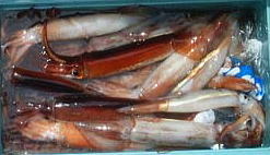 | ヤリイカ | 水深150m. 中盤に入り沖合に移動する。流れは時折20m前後伸び,不安定な潮の流れが続く。 ここでも極端な小サバが私の竿のみ襲う。それも水深130m前後で掛かるので始末が悪い。 底に着けば確実にイカが掛かると確信するも,左舷トモの私に集中した。 今度は底へと願い投入するも私のみ底着せず,7投目,ついにサバの群を抜けた。 船頭はサバと仕掛けの相性が合い過ぎると言うが。 イカが掛かり上げた途端,何処かリールのボタンを押してしまったようだ。 棚センサーが利き巻き上げが出来ない。半自動が手元で道糸を切らせた。 運良く,150号の仕掛けは竿先のガイドに絡み落ちなかった。 竿も無事である。手元のリール支えの部分がやや弱まった模様。 その後,底着でイカが1杯ずつではあるが掛かる。 そしてフラッシュは底で,きつく段々に誘い,ゆっくり利き合せしてヤリ3杯を祭りながら上げた。 |