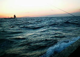 後半,マンボーが現れた。カモメの群に現れたマンボーは背ビレのみ海上に出している。 そのマンボーが左舷トモより真近に現れた。今まで見たサンシャイン水族館のマンボーよりでかい。 動きはゆるやかに,のんびり,さ迷っているようにも思える。 大き過ぎて捕獲は無理。モリで射せば食い付くが,凄い強力に船頭1人では支え切れぬと。 下手をすると小船を転覆する力がある。 潜らず捕まえられたとしても船に縛りつけ港へ引きずる以外ない。 好奇心の強いマンボーは船首を廻り,左舷トモの私の所にも廻ってきた。 その後,移動しサバの群も去り底着するも食いはなくなった。漁探に反応強いも食いはなくなった。 再び前の漁場に戻るも小サバのみ。最後のアタリを上げるもサバの猛攻を受け,ツノにイカの足が残るのみ。 11時15分納竿, ウネリは増し南西に変った強い風に,他船は既に早揚り,周りに船はなく帰港した。 浜に出て更に南風は強まる。 前,中盤は玉型11cmツノ×5,+赤白布スッテ小が良く乗った。ここまで船中トップをキープした。 イカの反応薄い中,全ツノに乗る。 後半に目付き魚型ツノ14cmがポイントとなる。反応あるも釣れぬ中,ミヨシで強烈に掛かりだす。 特に右舷ミヨシ,友江氏は一荷,3杯掛けが続き,全ツノに乗る。 オモリは130〜150,自由に。船頭は150の方が乗る確率は強いと強調していた。 飲物を求めクーラーからビニール袋を開けると玉葱と人参がまとまって出てきた。 夜半,台所で詰めたはずのビールがない。袋を間違えた模様。 竹の子が旬を迎えた。帰路,喜多方街道の路肩には店が列をなしていた。 ヤリイカ7,(20〜35cm,中スルメイカ9,サバ1, 小サバは楽に束を超した。 |