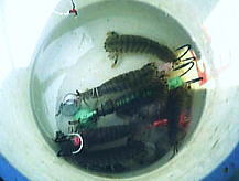 又今回はくじ引きで紅白に分かれ総重量で争った。これも白,負ける事となる。 試釣の効果もなく落ち込むのみ。次回ォめに15mm.垂らし5mmにし目立たせた。 急にイナッコのような引きにヒレハゼ17cmが食った。 2度目を狙うも引きは同じ,根に入り込まれ仕掛けごと失う。 |