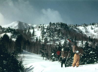 | 2月28日風強く雪後曇. 五色―家形ヒュッテh1⇔兵子の鞍部偵察 五色温泉bc7:20一10:05賽ノ河原出口:25一13:? 家形ヒュッテhc1 今日からツァーが始まる。 僕等は偵察を終え.待ちに待った縦走の日を向かいる。 昨夜遅くまでパッキングした荷が背に乗っている。外の吹雪もなんのその。2日間の休息が爆発するようだった。 弾丸滑降裏の径.血のみなぎる登行に足も軽く.共に出た根岸パーティをグングン離して行く。 ガスの賽ノ河原左から保坂先輩と私.鈴木.田沼 分岐の急斜面を下り.賽ノ河原にでる。標識に導かれると河原は雲も切れ出した。適当に汗ばむ快い登行が続く。 緑樹山荘まではラッセルされ楽に進む。東海大WCに感謝しながら幾つか沢を越した。 リーダーの捻挫 硫黄けの強い沢筋で保坂さんが右手を捻る。かなり痛いそうだが応急処置後.片手の登行でヒュッテまで行くこととなった。 緑樹山荘を過ぎ深くなったラッセルは急登も加わり.トップの交代も激しくなった。 保坂さんの手が痛々しいが馬力にものをいわせヒュッテへと。 ヒュッテでは秋に入山した山小屋隊のおかげで.充分用意された薪がある。暖かいストーブがある。・・家形ヒュッテ修理Top 偵察.家形ヒュッテ⇔家形山.樹氷帯 |