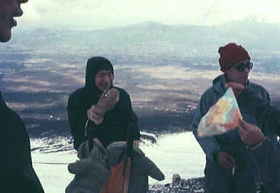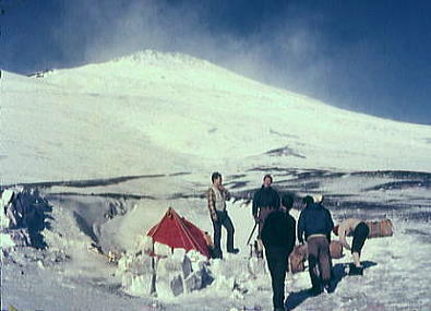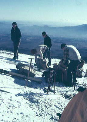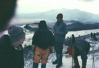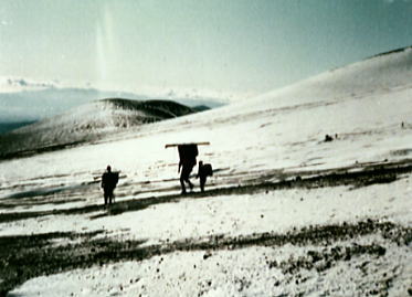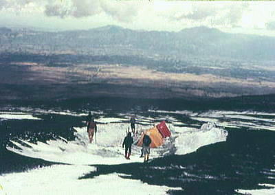 | 1月02日.快晴.bc10:05一11:00二合目=11:40御殿場. 下山 うららかな下山日和.雪煙を吹き上げる富士を背に中山.新津.根岸各氏を残し山を降りる。 私と田沼は又.明後日には信州の雪を踏むことになる。戸狩での冬合宿が待っている。 下界に下りる。冬の陽差しを浴び雲上から下りる。 海岸沿いを走る相模の海から裾野を越え,丘の上に立つ箱根の山を正面に仰いだ。澄み切った眺望が続く。 僕等はは腐れ掻けた新雪を踏み締め.太郎坊へと下山を楽しんでいる。 冨山.田中.松村.田沼.(下山).他のメンバーは翌日下山. アタックにより左耳第2度凍傷. 夜半から変形.分泌液出るも原因はあくまで自信過剰にあった。 2年前.八ケ岳阿弥陀南稜で同じ経験をしている。この時も同じ過信しきゆしていた。 私一人,気持良く行動するも.持参した目出帽を被らなかった。痛みはないが後で変形を恐れた。帰京後.誰にも云えず無言で過ごす。 卒業後に「赤レンガ」を含め次第に預かりだした装備. 冬用ビニロン6人天.冬用ナイロン3人天.11mm麻縄40m.11mmナイロン40m.アイスバイル.背負子.スコップ.ナタ.雑貨 2008.12.30.山中湖平野.2000年代に入り雪線の上昇が見られる。異常気象温暖化か? 冬富士U.その1.三合目ベースキャンプとアタック 冬富士U.その2.スキー |