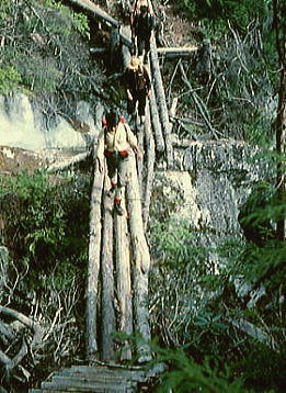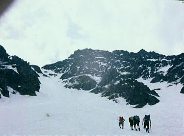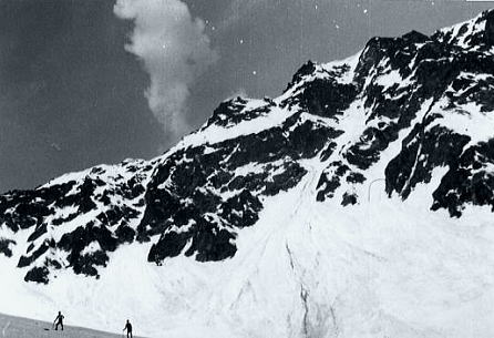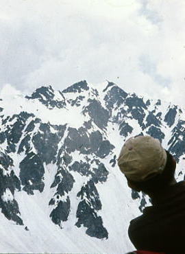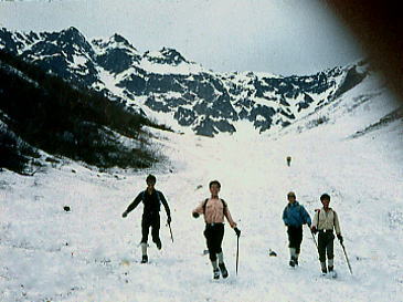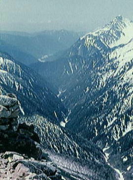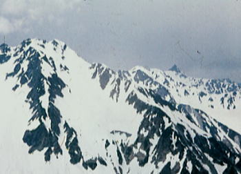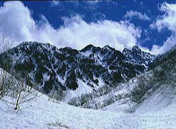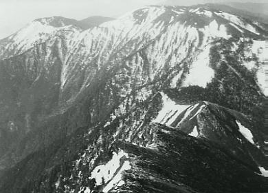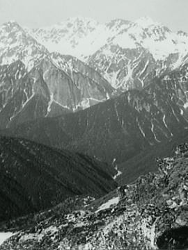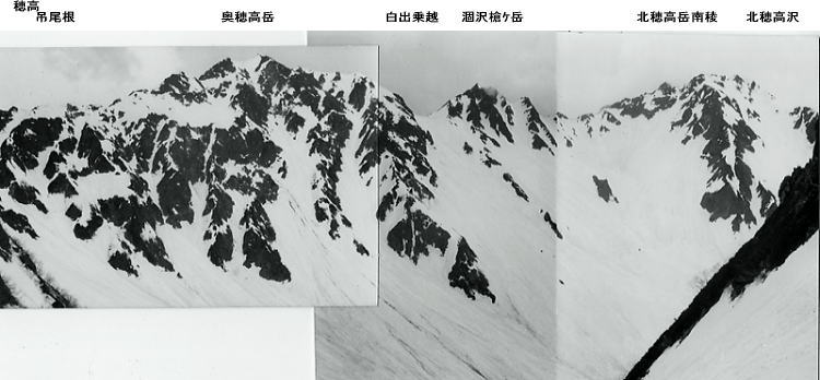 | 以外と長い蝶ヶ岳へのアプローチ. 岩の推積したガラガラの尾根の高原のような平坦地. 蝶ケ岳ののっぺらな頂が足元に広がっている。 ここは槍穂の展望には絶好の場所だった。涸沢のカールが雪をまとい眼に大きく入いる。 改めて見ていると涸沢カールは以外と高度を保っている。 明日はあの高さまで.涸沢へ入る。仲間達の目は皆.その雪の王国を見詰めていた。 上黒沢下降 上黒沢から横尾谷へ大天井からの梓川. 左奥.窪溝が上黒沢 下降地点 上黒沢下降 蝶槍を越え蝶ヶ岳北面.2664.3mのコブから登山道を外し.直接横尾へ下降する。 上黒沢ツメより残雪を求め.梓川まで藪を漕ぎ.強引な下降を始めた。 ここ常念山脈の西面山腹の沢沿いは樹林に覆われ.目立つ滝が乏しく.残雪の下山には適していた。 明るいガラ山から這松へ.更に黒木の谷間に入る。 残り少ない雪渓を求め,尻セードでブッシュを漕ぎ.下りをよい事に強引に上黒沢へ滑り込む。 残雪を求め切れれば藪を漕ぐ。そして又残雪に飛び付き梓川へ直接降りた。 傾斜は以外にあった。雪がなければ.真っ直ぐ藪に向かいキスリングを躍らせた。 オーバーズボンにキスリング.鉄玉となり強引に下降する。 斑な残雪も探すと以外と続いていた。途切れても藪に飽きる前に残雪に行き当たる。藪は強引に進む以外ない。 谷間に落ちるよう空を切ればヤブは開け.そして横尾の幕営地へ駈け込んだ。 今回はグリセードより強引な尻セードの下降の方が楽で.最後まで続く傾斜に助けられている。 横尾谷出合 出合の河原Tsで焚火 横尾.今日は行程が短い上.黒沢を滑り落ちた。早過ぎる幕営には焚火が一番よかった。 大きな倒木を1本探させた。後はナタさえあれば一日中.火は途切れる事はない。 ザックから停滞.予備食を集めだし.好きな物から炊事が始った。 食べる事に嫌がるも者はまず居ない。まして気侭な炊事.食べたい物を聞き.後は後輩に任した。 時折.先輩ともめるも.どうせ口に入ると私は黙っている。楽しいもめごとに疲れることはない。 よく喋り.よく食い.口はよく動いく。 横尾から北尾根Y峰をピストン |