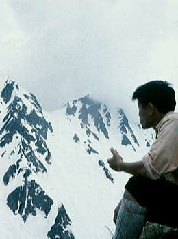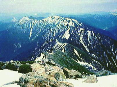 | 6月08日快晴. 常念岳山頂から上黒沢を下降―横尾(常念岳c2―横尾c3) 常念岳Ts2. 7:25一8:13(2572m):23一10:30蝶槍11:25一12:30(黒沢.水に出る):40一13:40横尾c3 常念岳 常念岳の頂で.眩いばかりの陽射しを天幕内で受け.その眩さに起こされる。テント口からは穂高の峰々が壮大に開かれている。 残雪に被われた槍ケ岳は穂先のみを黒い岩峰を覗かしていた。 昨夜,月光を浴び幻の如く望んだ岳が.今朝は陽光に照らされ.岳を些細なまでに映し出していた。 朝寝坊した僕等に今日ばかりは目覚めも清々しく思えた。景色も.テントの周りも.気分さえ全てが清々しい。 残雪の被る幕営地.そのテントを張った頂の残雪は常念に突き上げるツメから四方の谷へ落ちていた。 早速朝の炊事に.並行してパッキングと何時ものルールが始まった。 常念岳肩より常念の山並を見下ろす。 頂点が常念岳の幕営地蝶ヶ岳 絶景を仰ぎ.2本目でもう軽食を摂る 凸凹の樹林帯は残雪で埋まり.強い陽差しに汗が湧き上がる。体中から塩が噴きだしていた。 陽射しが強過ぎ.風もなく.蒸すむらむらする尾根だった。ザックは背にピッタリ吸い付き.背を濡らす。眼にも汗が沁み込み痛かった。 今日も暑い一日が始まった。休み7む一本で.もう暑さでバテ気味.うまい所に雪解け水が流れていた。 |