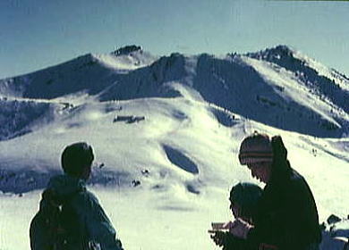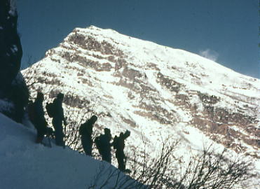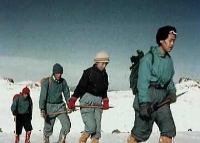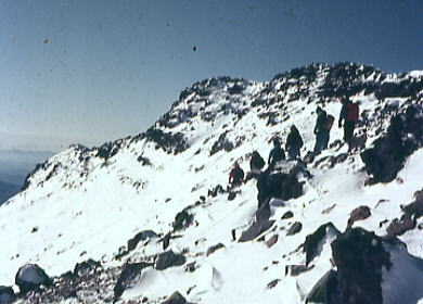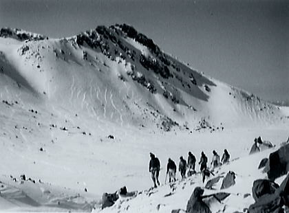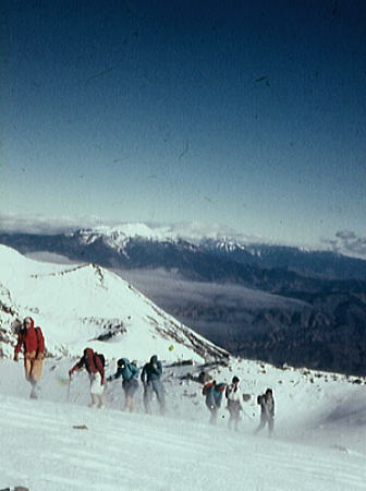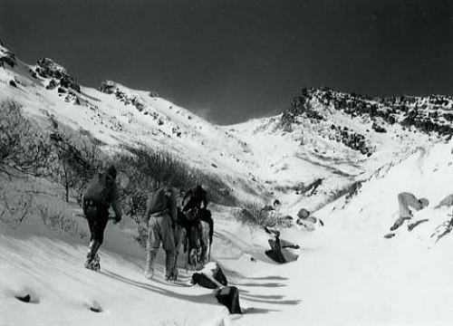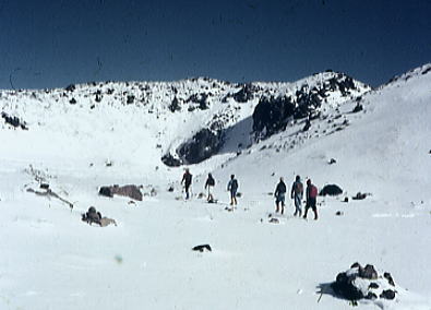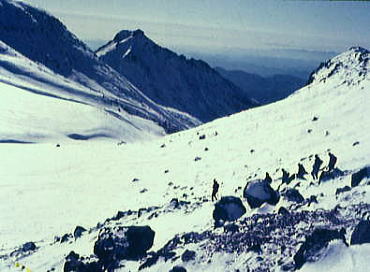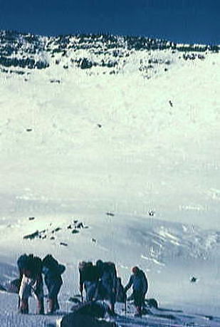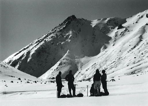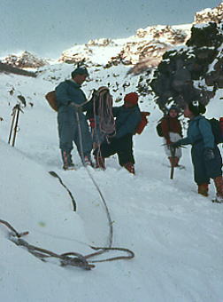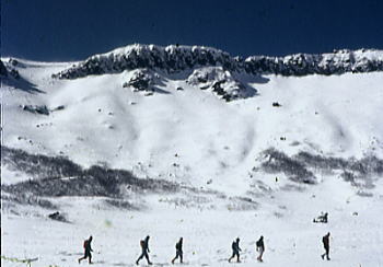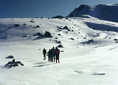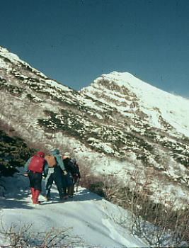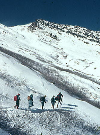 | トラバースルート 先に下山する滝島さん.和田と別れを告げ.外輪山の分岐を右に取る。 この夏ルートは幾つも沢を横切るルートは不能と思われていたが雪が落ち着いている上,積雪は少なかった。 継子岳は広い火口群の最北に位置し.ベースから距離もかなり離れたいた。 安全を考えると頂稜からのルートが最適と思われたが頂稜掛かる時間が長過ぎる。又少しの風でも一日中.風と争うこととなる。 パーティの全体の体力を考えると女子を含め限界があった。初めから停滞予備日は計画に含めず。その時は何処かのルートを省くことにした。 それを考慮すると三ノ池.直接ルートが最適と思われた。 今日の登行如何によるが最南端,継母岳が最後に残されている。 継母岳の登頂は今回最大の課題だった。列風に狭い稜.全員で立つことが出来るだろうか? 氷化した斜面を下降 朝日で雪の腐った潅木帯.境をトラバースする最短ルートを選ぶ。 谷底の日陰は氷化し気の張るトラバースを強いられている。ザイルを用い確保して沢底へ降ろす。 一歩々ステップを切る一年生の顔も真剣だ。ザイルが伸び.また伸びる。 ここから望む頂稜は写真で見るより.厳しく鋭い窪地で日陰が醍醐味を増さしていた。 ルンゼ状の沢が真直ぐ伸び.見上げる頂稜は雪煙を上げ仰がれた。その上に濃紺と云うより紫近い濃い蒼空が広がっている。 三ノ池火口まで.もう少しのトラバース。気は緩めない。 このルートは結果的に楽に済んでしまったが.もう少し積雪が多ければ引き返さなくてばならなかっただろう。 広くなり緩い窪み状の沢を詰める。ここも積雪との関係で東面はルートを選ぶのが難しくなるだろう。 今回は朝の硬く凍った雪面と谷の陰が功をなしていた。それを越せば自然と三ノ池にでられた。 |