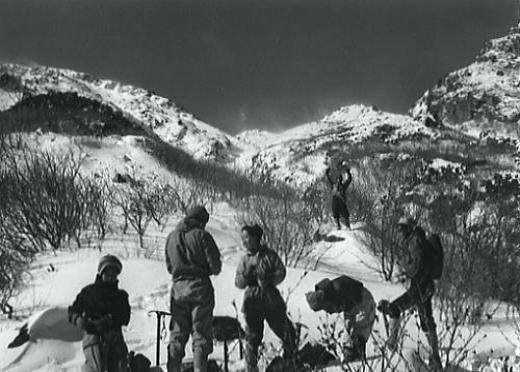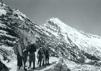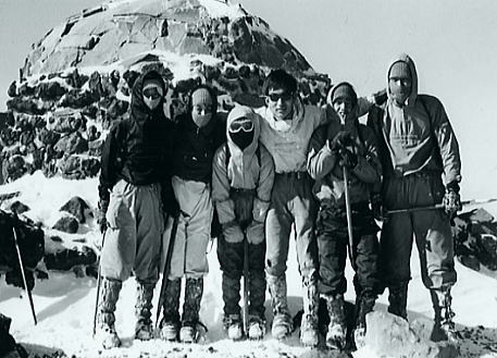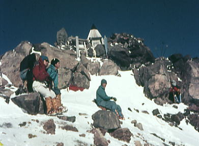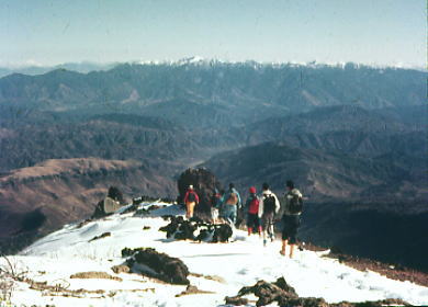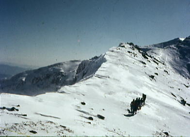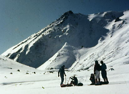アルバータのような摩利支天を右に見て広い犀ノ河原へ下り.二ノ池を横切るとベースへのルートが導きだされる。 標高2905mにある国内最高所にある湖も氷結し.雪被る鉢底に変わっていた。 ここから一ノ池の東の尾根を抜ければ.もう昨日のベースに戻ったルートは目の前になり, 昨日.一昨日と築いてきたトレースがルートとなり.ベースまで我々を導いていた。 広い裾野と木曽谷を挟み中央アルプス甲斐駒.千丈.北岳. 木曽駒と宝剣.三ノ岳 神経を充分に使い果たした主将の山田はサブリーダーとして任務を果たした。疲れは甚だしかったようだ。 ベースの戻った途端.疲れたと眠り込んでしまっている。 御嶽山U.1剣ヶ峰 御嶽山U.2お鉢廻り継子岳周回 御嶽山U.3剣ヶ峰と一ノ池炊事 |