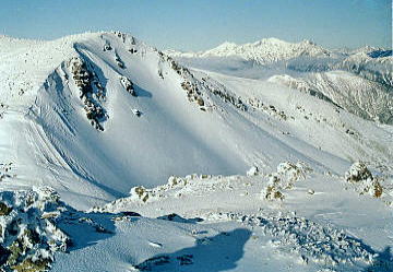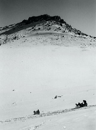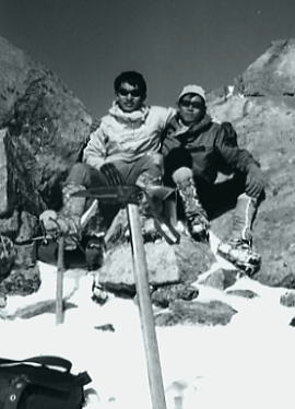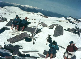 | 11月24日.晴後曇 女人堂bc4. 9:10一9:55九合目下10:05一10:45剣ヶ峰:50一10:55一ノ池. アタック最終日 再び剣ヶ峰に立つ。継母岳は断念. 目指す継母岳は偵察の結果.メンバーの精鋭化及び装備不足 特にザイル.ビナ.アイスハーケンの補強が必要で今回は手強い相手になってしまった。 その為.一ノ池での昼食を目的に贅沢な遊びを試みる。 食糧.コンロ.食器を各々ザックに詰めナベを背負い.贅沢な食事に出発した。 沼津.すこぶる元気になり.そしてこれで全員.剣ケ峰の頂に立つことができた。 アタック1日目と同じルートで頂に立つ。 一ノ池.雪原の真中でツエルトを被ってのラーメン料理. コッヘルでなくナベを持ち。 本格的なナベ料理の味は兎も角.大きな鍋から漁る姿は実に美味しかった。 |