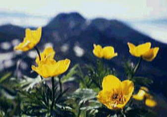 樹林帯を抜け高谷池にでると正面に火打山を見ながら小さな丘を越す。するとお花畑にでて.まもなく天狗の庭にでた。