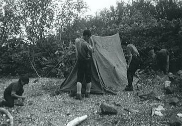林間学校らしいグループが幾つも見られた。我々は休暇村から西側に少し離れ.木々の密集する真川の河原に天張った。