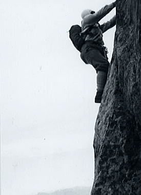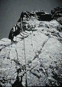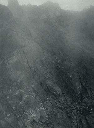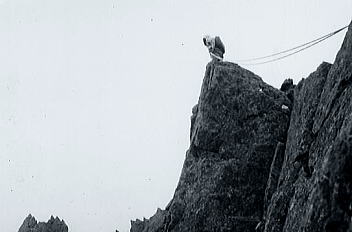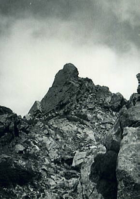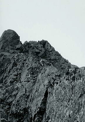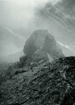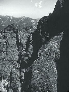 B沢寄りフェース気味をフリークライム. 次いてPBのB沢よりはアンザイレンで登攀する。 水俣川が足元に落ち込み高度感はある。岩は硬く快い登攀で滝谷らしくなった。 , 北山稜上部PCはその間々通過してコンテでP2手前の岩峰を。 更にP2はアンザイレンで直上する。清々しい登攀が続いた。高度感もありザイルがよく伸びる。 そしてコンテの後.ナイフエッジを数m跨ぎP1の直下にでた。 水野クラック |