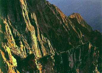 2007.09.01.キレットより第一.第二尾根 南峰より滝谷側を巻きながら松波岩の下.第二尾根基部に立つ。 登攀 P4を越え北山稜へトラバース北山稜 ![]() 北山稜.B沢側フェース気味の所をPcはフリーで滝谷 基部より尾根上を下ったため時間をロス.C沢左俣を下ってP1.P2を大きく巻き. P3上峰より小さく左俣側を巻きながら下峰を過ぎる。そしてP4で北山稜側を通って大休止.昼食にした。 今日は昨日の事もあり食糧は十分ある。その上.天候も安定していた。 焦りはないが先が判らず.程ほど下り.第二尾根に取り付く。 尾根自体は少し脆いが技術的なもの必要とせず.P4から北山稜にトラバースする。 尾根上は面白みがない。壁にぶつかり登りだした為.PAでP2支稜へ少し入り込む。 ここはハーケンの連打でフランケに入りそうになり.時間を少しロスした。 |