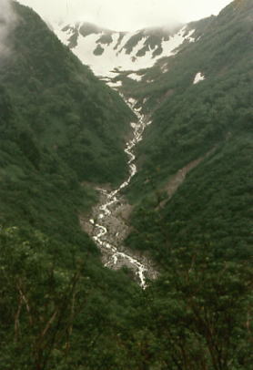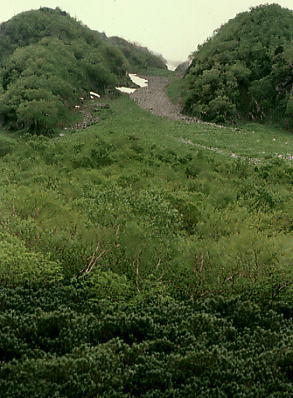 涸沢末端.穂高の岳涸沢を踏む ![]() 染ちゃんと八重ちゃん7月03日雨一時曇 涸沢散策 地下に潜っていた横尾谷の伏流も一夜明け増水し浸かりだす。 増水は橋の手前まで満ち.水汲みする手間を楽にした。 涸沢へ 午前中は雨止まず.午後の切れ目を狙い.涸沢まで入って見ることにした。 大滝へ登りに来た彼女達を宥める。更に一日延ばせば叶えてやらねばならないだろう。 明日は登攀を諦め下山する。その前に彼女達に雪原を見せようと。 涸沢に入れば見渡す限りの残雪がカールを覆っている。 深い樹葉が青々しく森の香りと雨露が清々しい。 彼女達の足取りはしっかりしていた。黙々歩む。 涸沢の雪渓は例年より幾らか少なそうだ。一張りのテントもなかった。pm2:00〜5:00 涸沢Top 北アルプス南部地形図 涸沢周辺地形図 6月04日晴. 下山 彼女達を追い出し.のんびり上高地に下る。陽はカンカン照り付け梅雨の中休み.下山は好天に恵まれた? 漸く横尾も活気立ち河畔径には往来する人が増してきた。 対岸に今年もケショウヤナギを見る。柔らかい若草色の長枝が河畔を撫で掛けていた。 彼 彼.こと長塩は高校同期で過って高校時代に互いに初めての南アルプスを2人で迎えている。 彼は明治山岳部マネジャーを経て社会人になり.私は立教へ。好く呑み好くじゃべった。 だが彼との山行は何時も何かトラブルに巻き込まれる。一度も計画通り遂行されたことがない。 それでいて何度共にしたことだろう。山でも酒だけは都会と同じよく呑んでいる。 否や.幾らかだけは共に自粛している。何しろ彼に会えば酒一升.ウィスキー1本と並に空になる。 滝谷クラック尾根.又は屏風中央カンテの登攀も行わず.装備はザックに重く沈んでいる。 山中は荒天だった。途絶えることなく降り続いた雨は岩壁を常に濡らし滝となり流れていた。 だが気は晴れ晴れしている。新宿で又.惨敗したと2人で祝杯を揚げることになるのだろう。 松本への帰路.函館で東亜航空64名全員死亡のニュースを耳にした。 徳沢の径![]() 昔は明大山岳部主務 横尾生活1.上高地―横尾bc 横尾生活2.横尾⇔涸沢.―上高地 山の経歴.経過Top |