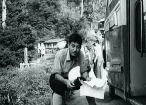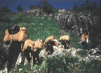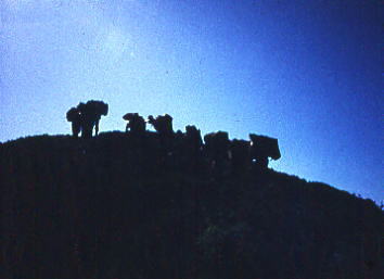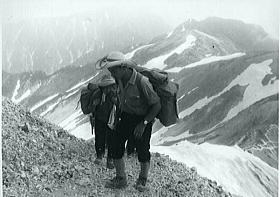 小谷温泉Ts4. 6:10一:25山田旅館前7:27.松本電鉄(小谷村営バス)¥150+50=9:00国鉄信濃四谷. アルプスへ 信越に入ってから妙高連峰を越え.昨夜は小谷温泉前で幕営している。 のんびり撤収したバス停前は朝方から蒸す強い陽差しを受け.30分ほど前から木蔭に陣取り.始発の路線バスを待っていた。 やがて信濃四谷から乗合バスは到着したが時間待ちが長く暫く今か今かと待たせているだけだった。 1つの山並を越え.早朝の忙しさもなく.のんびりした時を過している。今まではもうひと汗掻き.1本取っている時間帯だった。 乗合バスは沢沿いに中谷川を下り.小糸線に沿った国道を川尻小谷小糸川線に乗り,姫川沿にを遡る。 小谷温泉からほぼ信濃四谷駅まで1時間半の旅.下車し買い出しを済めば北アルプスに迎えられた。 9:00信濃四谷11:35.¥110+50=12:05猿倉13:18一13:56小14:06一14:51小15:00一16:00小:10一16:58三次郎沢.枝沢c5 信濃四谷買出し 大町行の路線バスは信濃四谷で下車.昼食を兼ね早速買い出しを済す。ここからは途中参加する一年女子.加茂がメンバーに加わる。 病後の彼女に付き添ってきた母親の心配をよそに.以外と元気な笑い顔。山へ登りたい気持を掻き立てていた。 東尾根上部草付きで再び信濃四谷駅前から乗り込んだ路線バスは松川の右岸道を遡り.右俣の北股入沿いの終点.猿倉登山口に入っている。 ここで差し入れの西瓜を口にして入山した。冷やされてはいないが何故か.山で食べる西瓜は常に美味い。 大雪渓への砂防工事線を右に分け.道標に導かれて鑓温泉への山径に入る。 蒸す暑さは相変わらず強い。乗り物疲れと買出し.1つの山並を越えた疲れがでてきたようだ。 アルプスに入る意気込みとは裏腹に.ペースは一行に捗らなかった。 それでも2パーティ同一行動の大部隊はジワジワに高度を上げていた。樹海の切れた双子尾根の鞍部にでる。 白馬三山 |