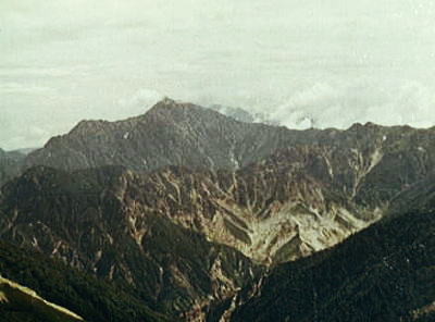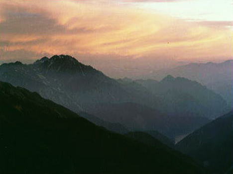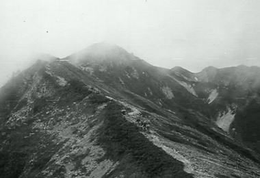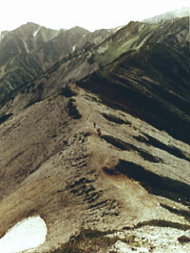 8月23日曇.烏帽子田圃―三ッ岳―野口五郎岳―岩苔乗越c8![]() 曇天で霞む朝方の烏帽子岳.南沢岳.不動岳.後方が立山.針ノ木岳 雲ノ平横断 烏帽子田圃c7.―野口五郎岳―岩苔乗越c8―雲ノ平三ッ岳 ![]() 砂礫帯を行く8月23日.曇後霧雨 南沢岳南面―烏帽子岳―野口五郎岳―岩苔乗越 起床5:30.南沢岳.鳥帽子岳鞍部Ts7.7:37一7:53鳥帽子岳一8:15鳥帽子小屋9:43一10:35三ッ岳一10:40小10:55 一12:00野口五郎小屋12:55一13:55小14:10一15:15小15:25一15:30水晶小屋一16:15岩苔乗越c8 裏銀へ 1本目.烏帽子小屋,水場が遠いのでかなり時間をロス.又D.E女子パーティからの伝文を受け取る。 それによると田沼を含め全員元気。一昨日12時頃既に烏帽子小屋に着き.その日の内にピストンしてしまったそうだ。 今日は雲ノ平へ向かっている。 野口五郎岳 ![]() 裏銀パノラマコースは曇天にもめげず.素晴らしい眺望を現わした。 ツラビソの林を抜けてしなく続く平坦で意外と近い稜線を三ッ岳に向かう。 雄大に見える山容は以外に近い。通り過ぎる大パノラマを舞台に.移り行く縦走の満足感を味わう。 高瀬川を隔て燕岳の稜が真近に迫り望まれた。一昨年中央アルプスに続き.登った初めての北アルプスだった。 残雪の尾根を槍ヶ岳へと歩んでいる。 東沢を隔てた赤牛岳の奥に薬師岳の大きな山容が屏風のよう広がっていた。重なり合う北アルプスの核心部.明後日にはあの頂に立つ。 Bパーティ(三浦)は今頃.急稜の突き上げる読売新道を水晶岳に向かい喘いでいる筈だ。皆頑張っている。 我々は漸く後立の頂稜に立った。花崗の砂礫径に距離を稼ぐ。三ッ岳の広大な山容を越え.巾広くなった稜線を歩んでいる。 濃いガスの中.1本野口五郎小屋岳は風化した白砂屑と這松に被われ.馬鹿広い稜線上で昼食にした。 意外にも行き通う登山者は少ない。8月の中旬過ぎると裏銀のメーンコースも静かな山旅を味わえそうだ。 水晶小屋にBパーティに添え書きをお願いし.野口五郎岳からガラ径を東沢乗越へ。 赤褐色の小岩峰を越えての痩尾根は単調そのものだった。歩む前方に北鎌尾根がアルプスのアルペンを強調するかのよう身を構えていた。 痩せ尾根になるにつれ飽き疲れか? ペースはガタッと落ちる。濃霧が湧き.ただひたすら岩苔乗越へ。 水晶より黒部川を囲む山々.遠く大日岳 スゴ乗る越からスゴノ頭と越中沢岳遥か遠方は大日岳.立山三山 水晶小屋跡に女子パーティがBパーティの為に置いた通信文と一緒に.こちらの状況などを手紙に残す。 2009年08月に弓折岳より双六池を抜け.三俣蓮華岳より水晶小屋に泊り.読売新道を尋ねている。 真新しい水晶小屋から裏銀座から後立山へ.薬師岳より五色原へと上廊下と東沢に挟まれた尾根を下った。 還暦を迎え見城先輩.同期鈴木と懐かしく愉しい珍道中を歩む。 水晶小屋よりBパーティが望む読売新道![]() 水晶(黒岳)より硫黄尾根明日はどんな事があっても太郎平まで行かなくてはならない。 殆どのパーティがもう集中地真近と云うのに.我がパーティは漸く半分終った感じで,奥穂高までかなり長いコースが残されている。 半日停滞とは云え疲労甚だしい。 食欲はあるが食糧が乏しいのが難点だった。食料に関する愚痴は二年生に任し.常に口を閉ざす以外なかった。 如何にか望める星屑に明日の好天を祈り.シュラフに潜り込む。・・岩苔乗越.消燈19:30 岩苔乗越雲の平―太郎小屋c9 高天原.水晶岳直下8月24日濃霧一時晴後曇. 起床5:00 岩苔乗越Ts8. 5:32一6:23(女子パーティTs)6:47一7:03雲ノ平小屋一7:37小7:47一(Cパーティ)一9:20薬師沢小屋9:35 一10:35左俣沢11:15一12:23小12:30一12:50太郎小屋一13:02. 2282m地点c9. 祖父岳 |