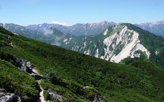 北薬師から ,遠方は槍.穂高連峰 . |