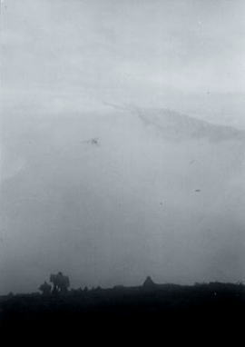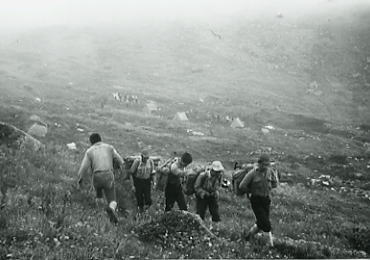 | 8月25日.濃霧後曇一時晴 起床2:30 太郎小屋Ts9.7:05⇔8:18薬師岳8:45一9:25c10 薬師岳 朝方よりテント場は雲の中 テントから顔を出すと昨日とは打って変わり.霧雨混ざりの凄い濃霧。改めて天気図を覗き込むはめになる。 濃霧と霧雨で天候待ち.仕方なく一度パッキングしたザックを解き.薬師岳を睨みつつ待っている。 なかなか天候回復が定まらず.重い雲の中にいる。何も見えぬ間々強引に薬師岳をピストンした。 視界は足元のみ.前の者に離れぬよう馬車馬の往復で走りに走る。 ムチに打たれた早馬の如く雨の滴る稜線を駈け上がり.幾つも偽ピークを越え.1時間ばかりで頂に立つ。 期待してはいかなったが頂からの立山連峰は望めず.一週間前北側の五色ケ原から仰いだ岳も.全てが暗い乳白色に包まれていた。 ツエルトを被り.女子パーティより差し入れの乾パンを食べる。味はないが一年生の新崎.斎藤はがむしゃらに食べた。 一息入れ.縦走してきた山並の眺望を想像しながらCsへ戻った。 今回の合宿には入山の折.寄った五色ケ原をここから望むことが1つのポイントとなっていた。 ただ残念だが.スケジュールを消化しただけのピストンになる。 太郎平.Ts 午後,雲が切れ晴れ間が望まれた。明日は飛ばすぞと全員が息込んでいる。 ここ太郎平の草原は雲ノ平とも異なり.大きな薬師の岳を従え.清々しい草原が何処までも続いていた。 午後.斎藤と太郎小屋まで散策した。 アルプスの西面には草原の大地が幾つもある。五色ケ原にここ.そして明日臨む双六の大地。 時折.射しだす陽が草原を輝かし.柔らかに煌めく下草が居心地よさをかもち出している。 長閑だ。裾野の山波も開け.贅沢なテントサイドとなった。 午後.ラジウスの調子悪く石油1リッター弱を使用.修理に精をだす。 薬師岳と金作谷カール |