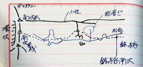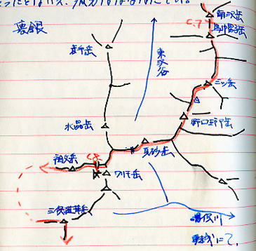 夏合宿Ⅲ.立山~穂高岳.その2 南沢出合から薮漕ぎし後立山へ―雲ノ平に回り込み太郎平から薬師岳ピストン 夏合宿Ⅲ1.阿弥陀一立山一蔵之助平一南沢出合 夏合宿Ⅲ2.南沢出合一雲ノ平一太郎平⇔薬師岳 夏合宿Ⅲ3.太郎平一三俣蓮華岳一槍ヶ岳⇔中岳手前.一新穂高 針ノ木谷南沢出合停滞c6 . ![]() 針ノ木岳尾根末端の元サワボ川と針ノ木谷 平の渡し.対岸奥が南沢出合 8月21日曇.南沢出合.完全停滞 熱低が台風に発達し.今日正午には本州に上陸の恐れあり。 烏帽子岳へ登る前に停滞を取るのは惜しかったが中盤に備え鋭気を養うこととした。 のんびりホットケーキを焼きながら一日を過ごす。天気は崩れるどころか晴れ間を見せ.一日中やきもちさせられた。 それにしても気侭な台風だ。米国ではよく女性の名が付けられているが? テントに寝転んでの会話は.もっぱら飯と彼女の話題に尽きている。 台風 21時の天気図によると台風18号は四国沖.300k付近.988ミリバールに発達した。 中心付近.最大風速20m.北東300k以内.北西200k以内は15m以上の暴風雨で.遅くとも明日正午には上陸する可能性が濃厚となる。 又東海沖には銚子沖より前線が流れ.末端が台風の前に延びている。 既に大阪は雨に叩かれてをり,進路は北と北西の間を通ると予報され,我々の真上が通り易くなった。 明日は最終案として烏帽子岳まで詰める予定でいる。・・消燈18:00 南沢出合―南沢林道―南沢岳南面c7 南沢乗越.ツメの崩壊南沢略図 |