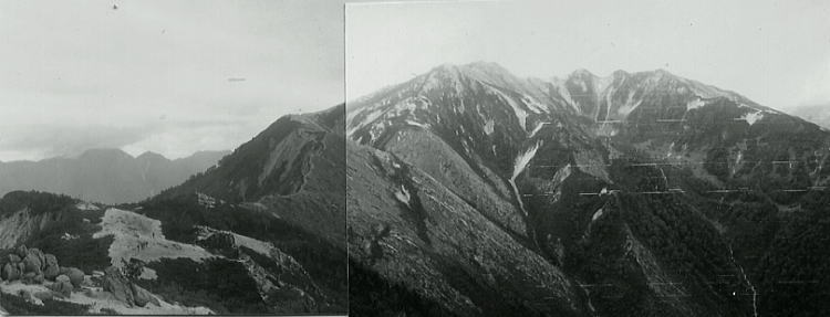 | 藪漕ぎルート 起床が遅れた為.出発が5時になってしまった。前日の休養で全員すこぶる元気。 南沢に入り一本取った後.高度1800m地点より南沢岳北尾根のガラ沢を詰める。 台風は以前とその兆候を現わせず.ブッシュにルートを取った。 出合からは不快な歩き難いゴーロを進む。続くツメは脆くボロボロの為.左へ捲き気味に詰め藪径に入いる。 潅木帯を左右に泳ぐよう漕ぎ.南沢岳南沢尾根上へ。岳樺の林中に今日2本目の大休止を取る。 昼食 山男の潜在的食魔性は食べるとなると全員が猛ハッスルし.アッと言う間に飯盒を空にした。 御数が少ない中.皆よく食べる。飯盒の底は一年生の特権になっているが.多めに炊くこともできず競争するよう食べている。 よく田中先輩がRHCの部員たるものはブルジョワの精神がなければならないと.酒を呑むとよく説教されていた。 その弟子達である。よく云われていた言葉であるが.今は誰も論ずる者はいない世界に入っている。 沢を遡り残雪を抜けるとガラ場が続く。 ツメはかなり傾斜が増し浮き石が多い。足元から落石が続き.左寄りに巻き気味に藪に潜り込む。 重荷を背負ってバテ気味に浮石は如何しようもないが。ラストの僕は升窪地の登りで落石を避ける事もできず,怖い一言に尽きる。 獣径 北の枝尾根には藪の中.よく見ると斑な道筋が如何にか慎ましく付いていた。 丁寧に探った獣径は南沢尾根上に続いていた。 藪を漕ぎ尾根上に出て.かすかな踏み跡を頼りに稜線にでる。 枝尾根の小径は1時間半程で.沢からのよく踏み固められた南沢新道の肩に合わさった。 再び頂稜に出て 南沢乗越と南沢岳.左が烏帽子岩.2010.08烏帽子の稜 露岩に腰を下し.ガスに包まれつつある立山連峰を仰ぐ。合宿ももう後半になる。望む眺望にファイトを掻きたてられた。 ガスは這い始めて天気は崩れそうだった。 陽も陰掛かり濃霧の被る頂は一汗掻き終えた後で.この上もなく心地よい。 先を急ぎ南沢岳南面鞍部の庭園的な小平地.烏帽子田圃に宿を求める。幕営には幾らでも適地あった。 ただ水の便が悪く腐った池の水を沸騰して利用した。今日ばかりは全員が正露丸の世話になる。 烏帽子岳と烏帽子田圃c7 南沢岳南肩より.2010.08前日停滞した事だし台風は10時になっても.その兆候を現さなかった。 故藪漕ぎルートを取った。これでビバークを残すのみとなる.最後の藪漕ぎで疲労は甚だしい。・・消燈22:00 五色ヶ原 右上が立山三山鷲岳と鳶岳に挟まれた五色ヶ原南東面. 手前は越中沢岳から派生する尾根上の木梚山2301.1m 五色ヶ原岳 目標にしてきた五色ヶ原を黒部川を挟み右手対岸から望むようなる。入山の折.初めて立った草原の頂が五色ヶ原。 次の目標は対岸の薬師岳.どんよりした雲が頂に掛かり.ここから目指す薬師岳は望めなかった。 これから雲ノ平を抜ける頂稜の縦走が待っている。 明日は台風の影響如何に関らず雲ノ平まで行く予定でいる。 食糧確保を含めC.D.Eパーティに会える事を願い.希望を持ち山稜の旅を味わった。 南沢岳南面―槍ヶ岳縦走図 追分~平.横断図