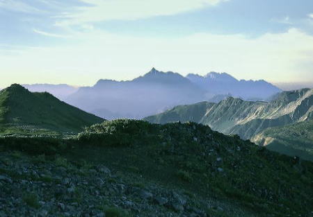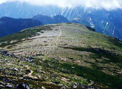 双六から三俣蓮華.遠く薬師岳 双六の大地 . |