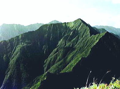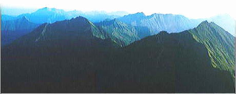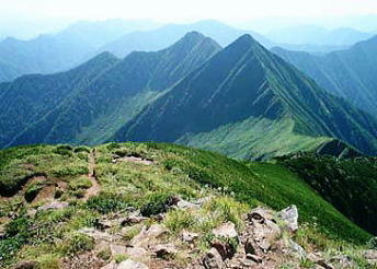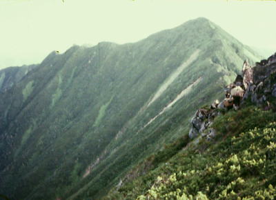 | 8月06日晴後曇 初の頂から札内川九ノ沢カール 八ッ沢カールTs4. 4:50一6:30ピーク手前:45一7:10カムイエクウチカウシ山:50一8:45九ノ沢カール手前9:00一9:27九ノ沢カールテ5 八ッ沢カール撤収北の国.初の頂へ 朝の仕度を終えると広大なカールの台地は朝日を冥一杯浴びていた。 後輩達は北国の初の頂へと心を躍らせ.清々しい顔でテント撤収に精をだしている。 昨日登ってきた八ノ沢は深い谷間が刻まれ.これから目指すカムイエクウチカウシ山は大きなガレ溝を構え.ピラミット峰と肩を並べ抉るよう見上げられた。 左側から巻き込むよう南側の鞍部にでて.頂稜を詰める。 カールからは急登の連続でカムイエクウチカウシ山から南東に延びる稜.ピラミット1853mとの鞍部1700mを目指し突き上がる。 朝から汗の滴る登り.頂稜に出るまでにひと苦労させられた。南東尾根に乗ると今度は小コブを幾つか越え.這松の絡む踏み跡径になっていた。 頂稜にでて左手にコイボックカールを見下ろせる高度になると直ぐ北西側にカムイエクウチカウシの大きな山容が迎えでる。 これから望む北方稜線 北海道に入り初めての頂.カムイエクウチカウシ山待望の頂 入渓して4日目.カムイエクウチカウシ山の頂.1等三角点峰1979.5mに立つ。標高1979m.基準点は「札内岳」。 幌尻岳に次ぐ日高山脈第2の高峰で.日高山脈十勝国立公園内になる。 幾らか霞むもパノラマに.澄んだ空気が頂を包んでいた。 入山初日はコイクシュ札内川出合で幕営し.増水の渡渉を繰り返し,六ノ沢先で2日目を迎えた。 そして踏み跡があるようでない径を遡り.昨日カムイエクウチカウシ山の懐.八ノ沢カールに遡り着く。 1つの頂に立つまでが長かった。東京から6日目にし.漸く日高の頂に立った。 山頂より南面に聳えるピラミット峰と後方は1807m峰北方山稜 ![]() 1826m峰方面 遠く望む幌尻岳 カムイエクウチカウシ山から北面の山々を遠望 ![]() 左遠方より幌尻.エサオマントッタ別岳.札内岳. 手前に綴りナメワッカ岳.1917m峰.そして最初に進む1900m峰. 右後方は札内岳 山頂からの眺望は素晴らしい。 汗は出るものの蒸す暑さはない。各々が頂に立ち.自分の目で北海道の山並を見詰めている。 感無量の世界だろう。特にリーダーの工藤はどんな気持ちで見詰めているのだろうか。 北海道に来て初めて「頑張れ節」をガナる。稜にでて踏み跡もはっきりしてきた。 頂稜は一面這松に被われているもののアルペン的岩稜の突き出た顕著さは乏しい。 日高北部は大きな岳の連山と云うよりは.開拓されていない自然の山並が全てを覆い.藪絡みの広い裾野は沢沿いにしかアプローチは示さなかった。 裾野はまだ山径と言うよりは沢を渡り々.踏み跡を辿るようなる径が続いていた。そして頂稜にでてから確りした踏み跡と出会っている。 岳は岩壁を攀じる技術より.沢登りの基本さえ習得していれば.危険の薄い山に思えた。ただ馬力はいる。 南方に日高中部山域の眺望が望められる。コイカクシュ札内岳から奥深い峰々が続き.延々と続く藪山のようにも思えた。 頂に立ち.僕等は山の鋭さより.山の渋さに深みを抱かされていた。国境稜線に足を踏み込むと北部縦走の現実みを実感させられるようなる。 頂稜の1860m圏コブで1本 頂から北東へ1903m峰に延びる尾根.九ノ沢カールを分けている |