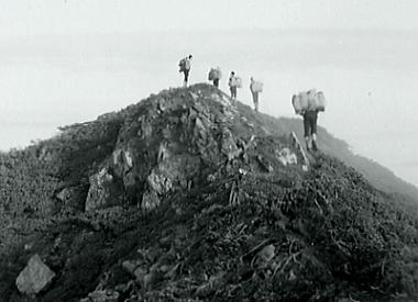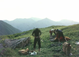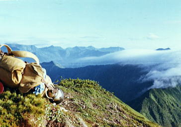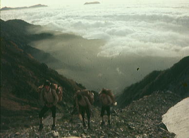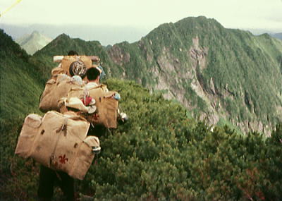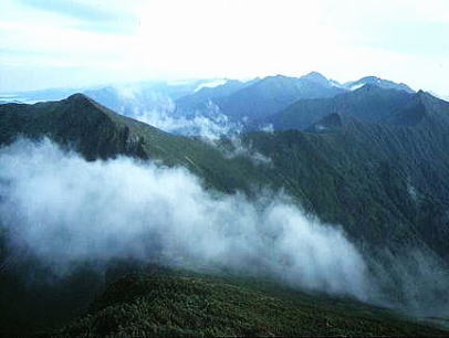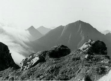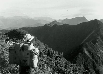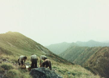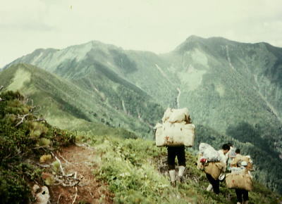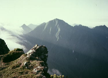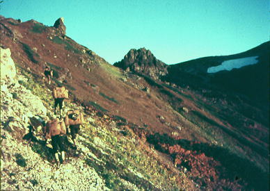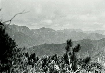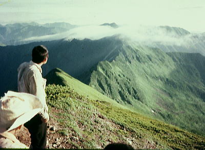 肩よりカムイエクウチカウシ山 ![]() カムイを越え望む南の稜 ![]() これから綴る北方の国境稜線 1917m峰より.右手下が札内川源流の九ノ沢カール足元の鞍部は九ノ沢カールに下る1732m地点. 浮雲の手前が1855m峰.十勝側に延びる尾根は九ノ沢カールと十ノ沢カールを分けている。直ぐ先のコブから左に延びり尾根はナメワッカ岳1799.1mに続く。 中央に聳えるのがエサオマントトッタベツ山と札内JP1890mからの尾根。遥か左遠方が幌尻岳と北トッタベツ岳, 頂稜 見渡す限り山又山が連なり.日高山に来たと云う実感がジワジワ現われだしている。 別の仲間のパーティは今.大雪山系を登っている。彼等も北海道の山々を今味わっている筈である。 カムイエクウチカウシ山に立ち.初めて北方に目指す山稜を望む。目をを向けるとこれから目指す峰々が.1つ々,綴り望められる。 遥か遠くエサマントッタ別岳や幌尻の山々も小さな凹凸を描きく望まれ.これから縦走の醍醐味を味わことになる。 1917m峰 シュンベツ川側を巻く1917m峰と1791m峰 ![]() 札内川九ノ沢カールへ 1732m鞍部はテントスペース有り.十勝側九沢カールへ下る 札内川九ノ沢カールの壮大なお花畑 設営風景上流側九ノ沢カールへ 早いが工藤の意見を取り入れ.九ノ沢カールでキャンプする。 エサオマントッタ別岳への頂稜は十勝側に幾つもカールを構えている。荒天の場合の避難地として心配のない場所になっていた。 入山時.あれだけ心配していた羆も,気にもせず.大らかな台地を僕等だけで常に独占していた。 1つの山を越えた歓びは本州とは違った意味で感動をもたらしていた。我がクラブとしては未知の山域でもある。 初めての北海道合宿. ここまで来るには入山まで資料集め検討に.長い時間を必要とした。 現地連絡として北大の人々を始め多くの人達にお世話になり.特に日高の資料は皆無で集めるのにも苦労させられている。 その中から執行部3年生は技量に合う山域を選び.集中地を選定しなくてはならなかった。 今,日高パーティは初めての頂に立ち,1つの山を越えた。 リーダー工藤の胸に秘めた歓びはひとしおであろう。僕は常にオブダーバーとして陰で付いている。 札内川を埋める十勝の雲海 7日,明け方の九ノ沢カール九ノ沢カール 入山以来,登山者に会わず,素晴らしい我々だけの山を今日も味わっている。 九ノ沢カールは八ノ沢カールと比べると,大分小さいが形は整い.美形に入る。ただ水場は涸れ源流を少し下らなければならなかった。 藪蚊は相変わらず獰猛で悪質だった。じっとしていると何処ともなく集まり.気ばかり気に掛かる。 4名で岩魚釣りにカールを下ったか藪蚊の猛襲を受け.その割り釣果はでなかった。大分下流まで下らなくては水量は乏しい。 又薮蚊以外に昆虫は捕れず.否見当たらず.エサのせいでもでもないがエサは持参する必要がある。 朝方から晴れ渡っていた天気も昼頃から曇りがち.九ノ沢カールではガスが湧き曇りがちになる。 小笠原高気圧が日本付近を覆っているが.気は不安定に。 関東には弱い低気圧があり.ハバロクスク付近にも前線を伴った低気圧がある。それでも一応の好天に恵まれた。 正午.九ノ沢カール1860m.w黴風.雲量10.層雲.視界可.24℃ 朝日を浴び再び国境尾根にでる8月07日晴後曇 九ノ沢カールからエサオマシトッタ別岳北カールへ 九ノ沢カールTs5, 4:40一5:55(1900m峰):10一7:30春別岳:40一8:50ナメワッカ分岐9:30一10:30小:40一11:35個:45 一12:45エサオマシトッタ別岳13:05一13:37径捜し一14:00エサオマシトッタ別岳北カールテ6 今日も朝方は素晴らしいモルゲンロートに迎えられ.札内川を埋める雲海を背に.確りした踏み跡で頂稜にでる。 幾らか肌寒かった大気も.国境稜線にでる頃には朝陽に暖められ.今日も暑い一日になりそうだ。 幌尻岳とエサマントッタベツ岳 国境尾根鞍部.1つ北側のコブより1917m峰.春別山1855m峰と1831m峰. 右端奥がエサオマントッタベツ岳.札内JPは切れている。 背は幌尻岳.北トッタベツ岳.トッタベツ岳.ピバイロ岳を遠望。 春別山1855m圏峰.十ノ沢カールを眼下に見下ろす |
