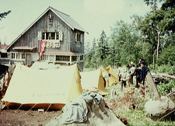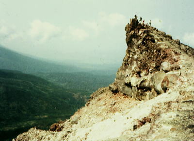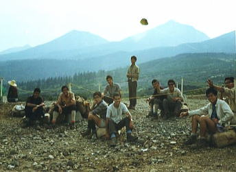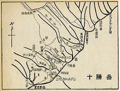 実弾演習 朝方,シュラフを背に横になっていると,「ヒュー!」と砲弾のような風が切る音と共に.地響きがここ集中地.キャンプサイドに伝わってきた。 じっとしていると微かに地面が揺れ動く。皿がカタカタ揺れた。 何事か? と起き上がるも砲弾の声と地響きが続いていた。頭上には「シュー!」.「シュー!」とかすむような響きが伝わってくる。 そして間を空け.定着したのが爆発音と共に食器を微々たりと踊らしていた。 近くに自衛隊の演習場があり.早朝より実弾演習を行っていた。これも北海道かと変に感心するも不思議だった。 不気味な振動と砲弾の飛ぶ音.それに破裂音が暫く続いていた。 十勝岳 全員でピストン 「スキー旅行案内」山と渓谷社.s34.12 十勝岳ウォッ地形図 ![]() s37年爆発口 前十勝岳集中地Ts16. 7:55⇔8:25望岳台上8:35一美瑛岳分岐一10:20十勝岳.新噴火口11:40一12:45. 十勝岳 5時起床.全員で十勝岳ピストンする。 望岳台で1本取る。本土では望めぬ雄大な荒れた原野が広がっている。盆地とは云えぬ広大な広さがある。 見渡す限り続く大地.北海道のスケールの大きさを.ここでも痛感させられた。 大所帯が列をなし.奇声を上げ登った。樹海を抜け廃墟のような硫黄鉱山跡を過ぎると荒々しい岩稜の火口壁にでる。 噴煙を上げる新しい火口を左手にやり過ごし.前十勝岳にでた。独立峰ではないが西側を鋭く切れ落としている。 陽が射しだし噴煙を上げる十勝岳. 荒地が続き日高の山とは又.違った山肌を現している。 十勝岳本峰には東南へ坦々とした砂礫帯を進む。 噴火 十勝岳は大正15年にも爆発し144人の死者と田畑に大損害を与えている。 その後,昭和37年の夏.わずかの間をおいて北アの焼岳.北海道の十勝岳.三宅島の雄山が次々に爆発した。 十勝岳では6月の爆発で硫黄を採掘していた従業員5名が死亡し11名が負傷した。 以来,山頂部の登山は禁止されていたが.39年夏より解除されている。 標高1120mの望岳台からは正面に噴煙の棚引く新しい火口.前十勝岳.十勝岳.美瑛岳などが連なり.広大な展望が得られている。 十勝岳避難小屋 避難小屋は1968年(s43年)に我々の入山に合わせるかのように林野庁上川中部森林管理署の管轄の下.避難小屋が建てられた。 場所は望岳台上から十勝岳への途中に設けられ.我々が入山の折.この真新しい避難小屋を確認し脇を通っている。 水場は遠く冬期以外登山者の利用は少なかったようだ。収容は40人. それから40年.2006年(平成18年)6月の強風により半崩壊し使用禁止となる。そして10月には小屋解体へと進んだ。 尚.当面再建の予定はない。 2006.10.25.台東中央図書館で「岳人」より 十勝岳避難小屋は冬山遭難防止などを考慮し再建され.2008年09月下旬にオープンする。 新小屋は旧小屋沿いの標高1300m地点。木造平屋建て.収容は20人で旧小屋の半分.トイレは未設置 資材費は上川中部森林管理署が提供し.建設費は美瑛町が負担する。 運動会パン食い競争 集合した全参加者我が精鋭パーティか? 笑い顔で最後を締める 集中地.最後に8月18日c16.吹上温泉解散 吹上温泉バス停で解散合宿費 食糧¥3.100.医療¥150.装備¥300.保険¥280.集中地¥600.写真¥150.スライド¥100.雑費¥100 天幕焼失事故に関する報告 唱和43年08月12日.合宿中.美瑛において女子パーティはローソクの火により天幕(61一1)及び7人分の個人装備を焼失する。 経過