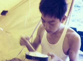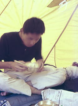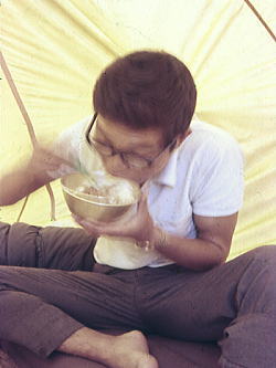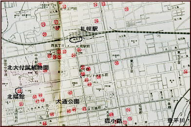 一方のテントに集まり.その後,雑談していた。それ為.消防団の人が騒ぎ出すまで全く気付かなかったらしい。 外へ出てみるとローソクが吊るしてあった部分より煙が上がり.天幕の後方から火が燃え上がる。 乾燥していた為.瞬く間に燃え.隣りのテントの延焼を防ぐのが精一杯だった。 ローソクの長さ約15cm.針金の長さ.約25cm・・現役時代として最大の惨事になる。 気侭な珍道中・・・道央の旅 8月18日札幌h17.曇一時雨.同期・・和田.大川.松村 山以外,何も予備知識を持たぬ東京人.三人が札幌にでる。 駅ホームに降り立つと車窓から手を振る大勢の後輩達.照れくさい歓喜の中.共に汗を掻いた仲間と別れた。 札幌駅周辺図 組合基本料金.2食付¥600〜6000タクシー料金.大型初乗り¥200.中¥110.小¥90 ラーメン まず,駅前の交番に寄り.ラ-メンの旨い所を問う。路地に入り込んだ店は.狭く入り混んでいた。 「公楽園横丁」.有名人のサインが壁を埋めている店。来客が多い印ではあるが汚く清潔感はない。 山から下りたばかりの者が言うのも可笑しいが.ここに頷く仲間達がいる。 メニューが凄い。麺に蟹類が乗り高価な値が付いていた。具は贅沢三昧で観光客は皆高価な代償を払い.満足しているのだろうか。 我々は当然.交番で薦められた素朴なラーメンを頼んだ。それでも美味かった。 宿もまた.駅の観光案内所に聞くこととなる。誰も先調べしてきた者は居なかった。 北大付属植物園脇で駅から近い割に質素な宿だった。52.北陽館¥1400 ひと風呂浴び食後.二人を強引に連れ出し夜の薄野へ。狐小路へ出向く。 貯金は全部下ろしてきた。金はあるぞと言いながらスナックのような居酒屋に寄る。 カウンターの上の大きなジャガイモとピーマンが目に付き北海道らしく印象的だった。ビールで乾杯.喉越しよい冷たい苦味が旨く.続けさまに呑む。 合宿を終えた体に酔いは早かった。宿への夜道もほろ酔い加減。夜更けに吹く風が路地を抜け心地よい。 8月19日.札幌.函館本線=小樽.タ=積丹b18 札幌の予備知識もなく,市内半日の観光バスに乗る。 何故か.北大に行き丘でジンギスカン料理を食べた。同期三人は初めての旅,共に北海道に来た証拠が欲しかった? これで話の種ができると。 札幌駅へ向いながら.ふと日本海を見たいと思ふ。積丹半島が頭に浮び小樽へと。 ![]() 積丹に陽が落ちる夕方.早めに小樽駅に降り立つ。 駅前横の市場でハタハタを仕入れた。調理方法は煮魚を勧められた。 もう夕闇が迫っている。タクシーの運ちゃんに野宿できる海岸を頼み.車を走らせた。 着いて.ゆっくり海を見る間もなく帳は落ちる。 慌てて見知らぬ波打ち際にツエルトを張った。小石のゴロゴロする床だが暗くなり我慢せざるえなかった。 朝食風景. 3人とも食欲は大勢 健康そのものの鈴木 天幕で霞む和田 食器不足で飯盒のふたを8月20日.積丹.国鉄バス(JR北海道バス.北海道中央バス)=余市.函館本線=函館=青函連絡船.泊 清々しい朝を迎えた。岩のゴツゴツした海岸の向こうに広い海原があり.穏やかに静かな地平線が見える。 陽が高さを取り戻すに連れ,また今日も蒸す暑さが戻ってきた。 どうも普通の観光客にはなれないようだ。ツエルト内で山と同じような食事を摂る。 国道にでてバス停を見付け余市にでた。昨日.この海岸では水死体が発見され.日本初の心臓移植を行ったそうだ。 車窓から望む限り.海は波もなく鏡のような凪の海原が広がっている。 余市から日本海沿いと別れ.倶知安駅ホームで偶然後輩達に再び出会う。互い笑い顔で交差した。 ホームの売店には旨そうな豪華な駅弁が並んでいた。どれも高く東京でも稀にしか並ばぬ代物が多かった。どれも観光客向けだろう。 新宿から甲府まででも学割を使い.弁当代を浮かす身.倍の値は買う気は毛頭起こらなかった。又もや3人とも並の弁当となる。 すっきり房型に裾野を広げる羊蹄山を西側から線路は巻き.内地のような谷間を抜けると長方部より噴火湾.太平洋にでる。 海岸線にへばり付くよう走る函館本線が走っている。 森駅,海岸に少しはみ出した無人駅,海辺に突き出しているよう思える。ホームは屋根もなければ何もない.台だけのホームだった。 列車が停まると何処からか.イカ飯弁当の立ち売りが始まった。2杯で\50.安いとなると手が早くでる。安くても美味いものはある。 函館本線は大沼廻りの往路とは異なり.駒ヶ岳の反対.山側を廻り込み.沼地を横切って走っていた。 湖畔より黄昏の駒ヶ岳を望みむ。列車はもう函館近くを告げていた。 連絡船を待つ間,最初で最後の贅沢なイカ料理を食べた。生イカの素麺切りが驚くほどの盛り上がった皿がテーブルにでた。 北海道に来た記念にとほうばる我々。そそくさに再び青函連絡船に乗車し,内地へ戻った。 そして青森駅ホームには上野駅まで鈍行のような急行列車が入線し待っていた。 8月21日.青森東北本線急行=上野 夏合宿W日高北部・十勝1. コイカクシュ札内川―八ノ沢カール 夏合宿W日高北部・十勝2 .カムイエクウチカウシ山―エサマン