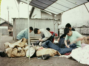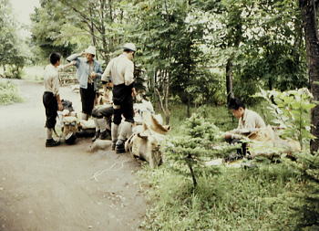| 帯広の幕営地 街に下りて帯広でのテントサイドは商工会議所の自転車置き場に指定された。お願いし場所は街の中央にある自転車置き場だった。 幕営地前は県道が走り.車の往来も激しい。家屋に囲まれた空地.整地する必要はないが不思議な気持を起こさせている。 山から下りると何時もは気にならぬ幕営地だが.人通りの多い大通り脇の小空地。お願いしたとは云え何か違和感を抱く場所だった。 写真で見ると路地のような場所だが.目の前は舗装道路。カニ族の団体が居座っているようだった。 屋根はあるもののグランシーを敷き.天幕を被る姿は明るいうちは見世物ならぬ乞食姿に見られがち。 8月15日晴 帯広c13.根室本線6:35=8:40富良野.富良野線=10:00美瑛.国鉄バス¥150=10:50白金.国鉄バス(道北バス)¥70 =11:05望岳台一11:50吹上温泉跡.集中地テ14. 15.16 眠い目を擦り早朝より列車に乗り込む。下界は好天に恵まれていた。 朝の陽差しが車窓一杯に溢れ.全てが眩しいく思えた。 狩勝峠に差しかかり車内放送から終戦記念日.黙祷のお願いが流れてきた。 長い列車の旅.下山して疲れたせいか車輪の音だけがよく響き.優しい音色が子守唄の如く.安らぎをもたらしていた。 座席の空きが目立つ列車にボックスを1人.占領し横たえる体。列車は峠を越えて行く。 明るい陽射しの車内は静かだった。仲間の会話も途切れ.目をつぶればうたた寝が待っていた。 陽炎が立った峠下.夕張は活気もなく寂れた炭坑の風景が車窓越えに流れている。 閉山した間々の荒廃した家屋が建ち並び.侘しさだけを漂わしていた。 美瑛 富良野で乗り換えると.もう直ぐ皆の集っている美瑛に近ずく。 帯広の広大な耕作地帯と異なり緩やか傾斜の無草の丘陵が続く。大きく波打つような丘は聞くところに因ると家畜用の畑が多い。 十勝の裾野は土地は肥えず.稲作農家は苦労しているとのこと。 それから40年近く経った現在.「パッチワーク」の丘として.広大で丘陵は素晴らしい景観が得られ観光地として伸びてきた。 中央ヨーロッパの畑地に類以し連作防止のため区画毎に異なる農作物を植え「パッチワーク」のような畑地が波打つ丘陵に続いている。 昭和20年後半に上田氏が香水花としてラベンダー畑を依託され,それが徐々に広まった。 化粧品用に最盛期を迎えたラベンダー畑が丘一面に耕作される。しかし輸入と合成香料の進歩で一時衰退を余儀された。 近年は観光に脚光を浴び.更に地元では臭い袋や独自加工生産品を生み.観光の名所として知名度を上げている。 テレビ長編ドラマ「北の国から」の放映も多大な影響があったようだ。 美瑛小学校での天幕焼失事故を知らずして.バスは十勝岳の裾野.吹上温泉へ。 北海道に入り.それぞれ分散し入山した仲間達と2週間振り.笑い顔で再会した。 8月16日晴. 集中地吹上温泉跡.白銀荘c14 北海道の大地に棚引く部旗 |