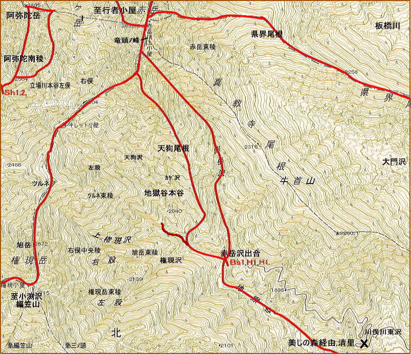Bs1は天狗尾根.Hは赤岳沢遡行時。県界尾根は3度とも14年置きに行者小屋Ts.H.Ts