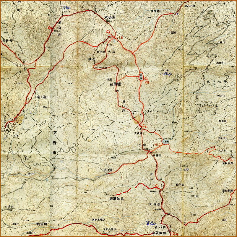 s42年04月には合宿偵察でカラ沢分岐より八千穂駅に下山.大岳川と湯沢との二股にでて.径は大石林へ抜けた。