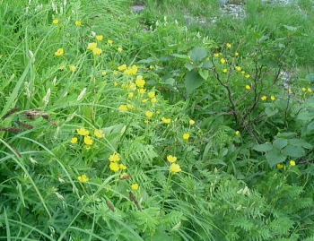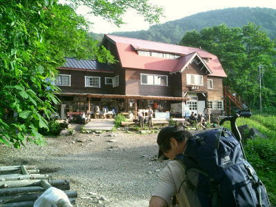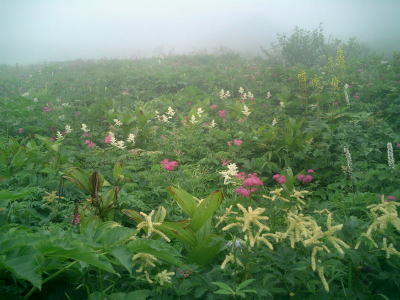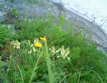 右下,今年崩壊した落石モーレンの末端今年は雪多いわりに融雪・崩壊が激しく.小雪渓からのルートは早めの秋径のルートに変わっている。 昼食時.脇の高山植物群 ミヤマオダマキ シラネアオイとシロウマタンポポ シナノキンバイ盆を過ぎるとやはり登山者は少なくなる。長い列になることもなく.静かな山の息を楽しんでいる。 そこに偶然.大川が入会をほのめかしていた「ハシタ登山会」のメンバーと出偶わした。 宇都宮周辺の中高年が集う山の会.歩みはバラバラだが統制は取れている。又.休む時の元気が心地よさを誘っていた。 我々と同じ中高年.昨夜は麓で1泊し.白馬岳を越え蓮華温泉へ抜けるそうだ。 「青年将校」と声を掛けられた。私のことらしい。「ハイ!」と返事をすると宿から差し入れのリンゴを丸ごと1個頂く。 リンゴの水っ気が美味い。ただ下界では味不足の部類に属するだろう。文句はないが。 遅い夏が全ての高山植物を一勢に咲かしている。雪渓上部に真新しく建てられたお花畑避難小屋を右横に見て.溢れるばかりに咲くお花畑に出会う。 2553m地点.大勢の登山者がホットした気持で憩んでいる。休むには広く丁度よい場所だった。 ガスの切れ目から頂稜が顔をだし始めていた。左上岩峰裏が1968年9月下旬のキャンプ地点.以外と昔の記憶がはっきり蘇ている。 彼と後輩を連れ.後立連峰を針ノ木雪渓まで南下した折.雪渓を直上した場所に当たる。66年08月のTs地点はこの上の村営頂上ホテルの幕営地。 お花畑避難小屋は今冬季に土台だけを残し全壊した。原因は雪崩によるものと推測されている。2007年07月現在撤去作業中. 再建については今後検討するとのこと。立派な小屋が1年経たずに崩壊してしまっている。 |