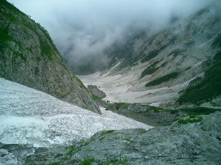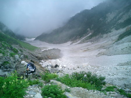 | 足筋 雪渓を抜けネブカ平に出ると久し振りの荷と登りの連続で.両足に負担が強く掛かりだす。騙し騙し一歩毎に高度を稼いで行く。 以外とダイレクトの登りが続いていた。足筋のみに気が掛かるようなる。 そしてちょっとした下りでも.気を抜くと肉離れの兆しか現れ? 足筋の筋肉がうごめき始めていた。 崩壊 2004年.ネブカ平右岸寄りから大きな崩壊があり。 2005年8月.谷中央.ネブカ平付近上部の雪渓で.登山道で落石・崩壊事故あり.8名が死傷。 本流の流れが左岸寄りに変わり.融雪が例年より早まる。 2006年7月.左岸寄り崩壊.モーレンの如く雪渓上に落石を積み重ねている。複数の死傷者がでた。 2006年8月28日.白馬鑓.鑓沢雪渓で崩壊あり.下山中の登山者2名が死傷。 現在.午後2時以降の大雪渓は入山が禁止になっている。 |