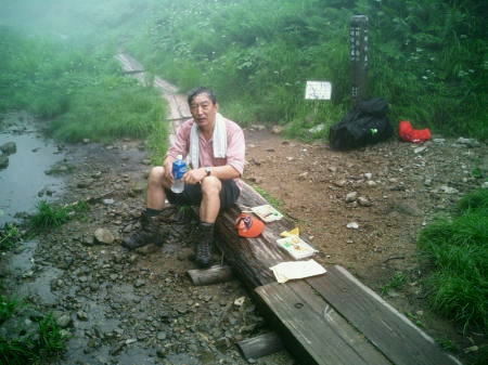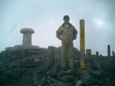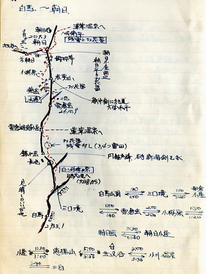 白馬岳―雪倉岳―朝日岳 ガスに霞む白馬山頂新田次郎著「強力伝」に登場する方位盤 白馬岳に立つ。降雨は小雨となり明るさを取り戻すも.視界は悪く0だった。 後立山の山波はこれから目指す隣りの雪倉山さえ望めずにいる。記録にと白馬岳の頂で彼の姿をカメラに収めた。 今回は調子がよければ.最後まで北上しようと思っている。ここからは目指す岳々が望めるられる筈だった。 佐渡と能登半島の間にある親不知に向かい.白馬の頂から北上する。再びガスが流れ込み.意に反し先は閉ざされる。 1966年08月の白馬岳〜朝日岳概念図メモ 女子夏合宿.当時2パーティ全員が途中下山した。コマクサとライチョウの親子 二重頂稜の馬の背からガラ場を抜けると三国境にでる。左側に広がるガラ場にコマクサの群生が見られた。 この周辺はコマクサを大分大掛かりに移植したと言われている。Oは粗過ぎるガラ場に.よく移植すことができたと感心を寄せていた。 頬に冷たく当たる霧粒が痛く.激しく流れ落ちている。そのガラ場には見るからに弱々しいコマクサが.疎らに孤高の如く咲き添っていた。 小さな花を震わせ,風に耐える姿は生命力の強さを感じさせ.それを考えると更に華麗な花に思えた。 又.「グェーグェー」と低い声を連発するライチョウの親子.番も.この場で幾度となく出偶していた。這松に身を任せ.幼鳥はチョコチョコ可愛らしく歩む。 一晩過ぎ仲間意識の生まれ始めた「ハシタ会」のメンバーに追い付き再会した。互いの健闘を祈り三国境で別れている。 ここは学生時代に後輩が病後の体に立ち向かえず.朝日岳を前にして縦走を諦め.途中下山した地点でもある。 今その地点に年老けた私達が立っている。多くの登山者が白馬大池方面に向かう中.ここから私達の第一歩が改めて始まる。 その先未知の径は遠く.まだ雷鳴が轟いていた。 雪倉避難小屋手前 鉢ヶ岳東面の雪渓横断朝方の雪渓は雪表を凍らせ.カッテングに苦労し.横断に不安を抱かさせられた。滑れば止まらぬ滑落が待っている。 前に通ったであろう人はアイゼンを付けていた。 ふと.学生時代.南ア荒川岳で同じような状態に陥り.別のパーティからザイルを借用したことを想いだしていた。 後続パーティを待ちステップを切て貰うことにした。間を空けず続々集まる登山者を待機させ.若者にステップを依頼する。 ガス濃い雪倉岳山頂雪倉岳北面のお花畑 ハクサンコザラのお花畑 一面に群がる華麗な花達夜半より鳴り続けた雷鳴は常に前方,日本海側から遠く響き轟いていた。11時頃には雷雲は東寄りに移動し治まった模様。 晴れていれば丘陵のようなお花畑の頂稜が足元から続いている筈だった。 両脇に深い谷を構えるも山上の楽園は尾根筋を広め雄大でなだらかなうねりを伴っていた。 歩む左右一杯に穏やかな起伏が広がり.2000mを越すにも係らず.丸味を帯びた大らかな尾根筋は雪田にお花畑を抱いている。 ニッコウキスゲも咲き誇り.ガスが途切れば申し分ない憩いの場所になっていることだろう。 水平道分岐 右に折れ朝日岳を越えるガスで見定められぬものの赤男山を捲き込むと木道が現れる。 池塘が散りばめられた長閑な草原には遅れた残雪に高山植物が一勢に咲き競っている。混ざり合う高山植物に時折足を停めている。 12時.朝日岳との分岐に立つ。長い木道が続いている。 池塘が点在し.周りには雨に叩かたトリカブトの紫の花が群をなし.見ているだけでも清々しい。又.ミズバショウの大きな葉が露を集めてもいた。 大休止 共に食欲が落ち.食い気はなくなるも食べねばと。彼はハシを付けず.強引にオカズだけでもと互い口へ運んでいる。 水平道を断念 2度.」朝日岳を登ることはないと山腹の水平歩道に捲くよう薦めるが.30代に来た彼の記憶が強く残されていた。 厳しい捲き径だと悟るよう説明されると断ることができなかった。「山と高原地図」の解説書にも同じような記載がなされていた。 ただ年毎に山道は改善されている筈である。彼の強引さもあるが.事前に白馬山荘ではっきり確認を取らなかったことが失敗だった。 朝日小屋には我々を越す筈のないメンバー達が1時間も前に到着していた。彼等.彼女等は朝方の雪渓トラバースで一緒になったメンバーだった。 驚きの顔で迎える彼女達。山越えは小屋番にも無言で笑われた。 7月24日現在まで水平道は雪多く安全が確保されないため通行禁止の処置が取られていたが下旬には開放されていた。 朝日岳山頂 一時のガスが切れる 朝日平へのイブリ谷朝日岳 水平道分岐より朝日岳まで直登と急坂が続いた。初っ端から階段状の根が這う径に遮られ.馬力のみが必要になる。 径は常に霧雨で濡れ抜かるんでいた。また雨が降りだしたて.1本取っている。 晴れていれば樹林に風は遮られ暑く蒸し.枯れ草の腐った匂いが漂うような場所だった。 今日最後の登りと小豆入り水羊羹とアミノ酸錠を共に口に運ぶび踏ん張る。 潅木から視界が開かれた頂は広い台地状の湿原に突然変わっいる。そして粘
