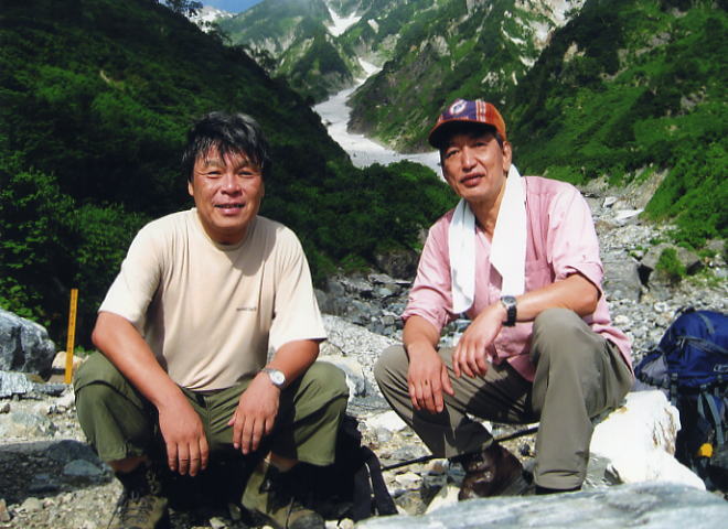 白馬岳栂海新道・・白馬岳三山Top 同期大川と白馬岳2932mから親不知ヒスイ海岸・海抜0mへ 北越急行・「ほくほく線」と中央東線 回顧の白馬大雪渓と未知の日本海へ 白馬岳から栂海新道を綴り.三方境から北アルプス北端の親不知ヒスイ海岸に立つ 2006年08月19〜23日.m大川.松村 猿倉から白馬岳大雪渓―朝日岳 再び朝日岳を越え栂海新道を北上―親不知 猿倉→白馬岳 三度.猿倉を尋ねる再び北アルプスへ 再び山に登り始めたのが昨年の赤岳清掃ハイク. その後大川と中秋の会津帝釈山.田代山を共にしている。それが切っ掛けとなり.白馬岳へ出向く。 40年前の女子夏合宿では妙高山から白馬三山に入り.朝日岳から蓮華温泉へ下る予定が後輩の体調不良で.三国境から途中下山していた。 又翌々年の晩秋には卒業を前にして.彼と後輩達を連れ.白馬大雪渓から針ノ木雪渓へ繋ぐ縦走をなしている。 現役,OBと後にもパーティを組み.又2人でよく珍道中の山に入っている。彼との山行を述べれば切がなかった。 再び山に登り始め.彼の最初の助言はゴアテックスの雨具を備えることだった。彼の希望で今回は朝日岳から北又へ下る計画を立ていた。 それが実り北アルプスを北上し日本海の小石混ざる砂浜親不知で登山靴を脱ぐことになる。