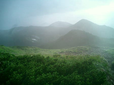 | 栂海新道 吹上ノコル. 蓮華温泉と梅海新道との分岐点にでる。ここから日本海まで約27kの長丁場が待っている。 蓮華温泉への径は昔.夏合宿で妙高から白馬三山を越え下る予定でいた。ただ1年生の病後の参加者がぶり返し. 2パーティ全員が何故か白馬大池から途中下山した。当時は盛夏の強い陽射しを浴び.滴る汗を流し.御返りの展望が素晴らしく続いた山行だった。 梅海新道に入る。オオシラビソ林の痩せた尾根径が頂稜を綴っている。 分岐を分けると尾根の両側は煩く茂る潅木に被われ.風を閉ざす曲根の径に変わっていた。跨ぎ.潜り.蜘蛛の巣を掻き分け歩む小径だった。 オオシラビソの林を潜り暫く行くと草付の小平地.照葉ノ池にでた。残雪と清やかな青臭い草の香りが広がっている。蒸し腐るような草の匂いではない。 遅く夏場も過ぎるも高山植物が草原に咲き競い.山上の隠れたオアシスを創っている。 その背後には白馬乗鞍や小蓮華山.そして白馬岳や旭岳が煌き望める筈だった。想像するだけで霞み岳は望めぬも,1本取りたくな所。 岩石の露骨もなく曲根の山径は以外と歩き易い。ペースを掴み下り1時間半の配分で距離を稼いでいる。 時折足元で「ザワザワ」と何かが蠢ぐ。今日初めて通う登山者に. 我々の前に山蟹に蛙。時には40〜50cmもある蛇が目の前に現われた。 ガラ場の長栂山お花畑 背稜は東北のような大らかな山波へと変わっている。雪田と草原.湿原を綴る木道は.長栂山手前まで続く。なだらかな丘稜のお花畑。 長栂山では丘のような広い岩礫地となるも.固定ロープや枝を掴みを抜け.一段下がった所で再び湿原にでた。 晩夏に係らずアヤメ平には名の如くアヤメが群生し.更に下ると草原と池塘との美しい配合が豊かな風景を創り.黒岩平まで続いていた。 2人しか居ない草原上.アミノグエンサンとブドウ糖を呑み.水羊羹とポカリ水で喉を潤す。 間食は摂るが昼食に手をださぬ彼。コンロを持つ彼が主導権を握り.3日目になるも.まだコンロは使われていなかった。 私の間食だけが減り続けている。今日は無人小屋.食料は私が献立を立てている。彼の仕切る自炊を楽しみに。 少し明るくなり千葉大隊の掛け声が遥か遠くから聞こえてきた。 高度は徐々に落ちるも以外と残雪は多い黒岩平 頂稜の黒部川側に捲くと長くと出た所は広く大らかな湿原状の帯をなしていた。木道と絡む土壌のクッションが心地よい。 覆われていた層雲が切れ明るさが増した。高曇が雪田を白く煌きださせている。若草色に燃える湿原とのコントラストが特に印象的に映っされた。 ずっとここに留まって居たい場所だった。歩み過ぎ去るのが勿体ないほどの安らぎの場所になる。残雪が広がり.急に明るさが増した為だろうか? 小川を造る雪解け水の音色もよい。踊る小さな光の妖精が飛び跳ねている。 私は「おとぎの国」と言う言葉が好きだ。何度も使わして頂いているが,ここもその1つに加えなければならなくなった。 時間の経つのを忘れ.何も考えずボ〜と寝転んでいたい秘密の場所になった。 もう8月下旬である。周りは高山植物に溢れ.山々の樹葉は焼け落ちることなく.清い若い色合いを示している。 オーバーに聞こえるも.ここだけは初夏の兆しを残していた。 黒岩山 樹林帯を登ると右手に中俣新道を分けている。jr小滝駅へ直接出る径. このエスケープは7時間のきつい急坂を伴っていた。 黒岩山へはここから先は左右の谷へ急激に抉り落した痩せた尾根に入り込む。 今日.初めて栂海新道を登って来た単独行の若き女性と擦れ違う。今朝.栂海小屋では土砂降りの為.1時間出発が遅れたとのこと。 数Kの違いで.我々は霧雨で済んでいた。 笹に覆われ小さな登降を繰り返し.径中央少し右寄りで熊の糞を見る。 少し黒ずんだ太い真新しい糞だった。先月尾瀬ヶ原で見かけた糞と全く同じ状態だった。 ここは獣道の感もあるが.狭い稜,先に熊が居ないことを願い歩む。 文子ノ池を過ぎるとほぼ同間隔でサワガニ山を通過する。 なるほど7〜8cm程の赤褐色気味の山蟹を何度か,足元にうずく姿を見付けている。何故ここだけか? その由来は? ペースはよい,2人の歩調は合っている。 北俣ノ水場 一時の陽射しも陰りだし.降りだした雨は霧雨から本降りとなる。鞍部.北俣ノ水場は北又谷側に4.5分下りた所にあった。 柔らかな美味い水だった。水3500ccを確保. 今晩から明日,白鳥岳までの炊事.飲料水になる。 今日最後の急坂を膝を庇うよう登る。土砂降りになった雨. 叩くような雨は激しさを増し.頭を上げられず,足元は滝の如く雨水が流れだした。 今日は頂稜に出てからは上カッパに短パンで通しているが.全てがビショ濡になった。勢いついた雨粒は汗をも流し.気温を急激に落としている。 初めてフードを被り叩かれる。頭を上げられぬ力が加わっていた。流れる雨に足を取られがちになるのを押さえ,一歩一歩.高みへと登る。 雨粒は滝状になり.怒涛の如く駆け落ち.足元からヒザまで跳ね上げている。そして雨は一時の激しさから息を切